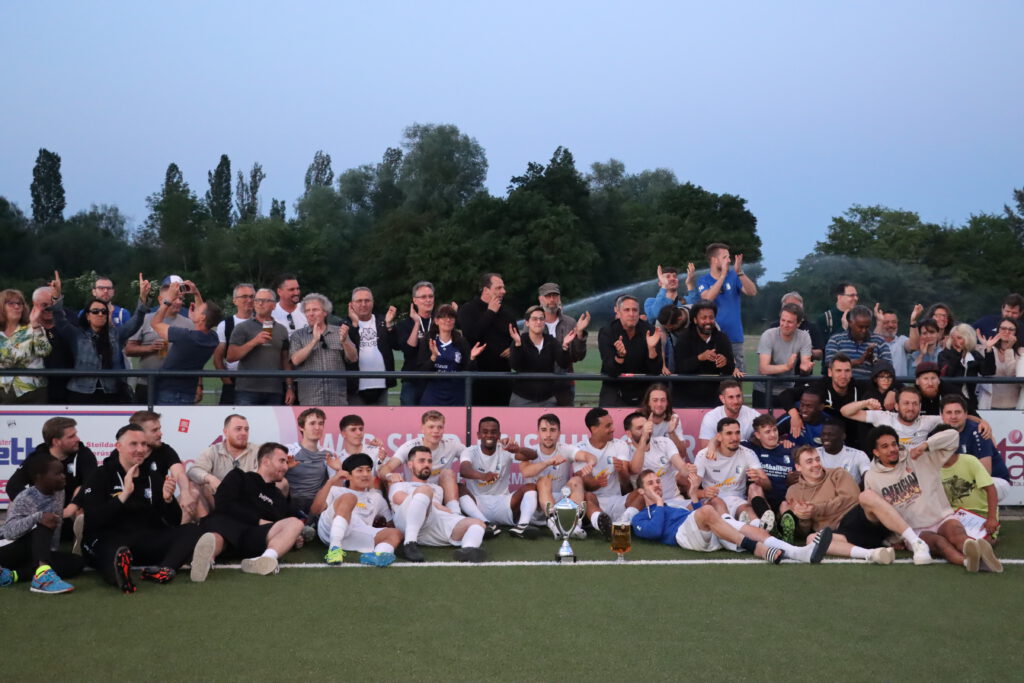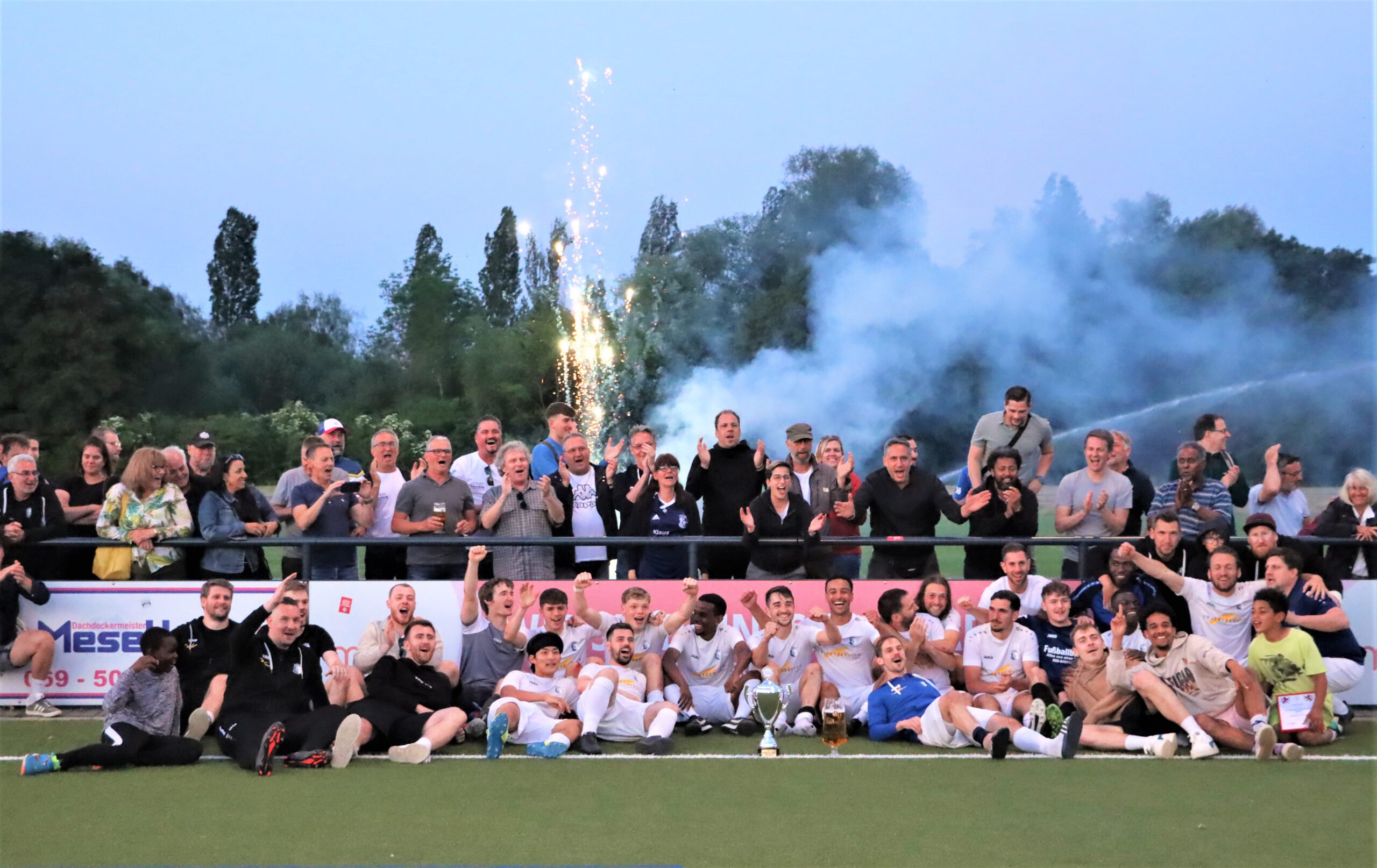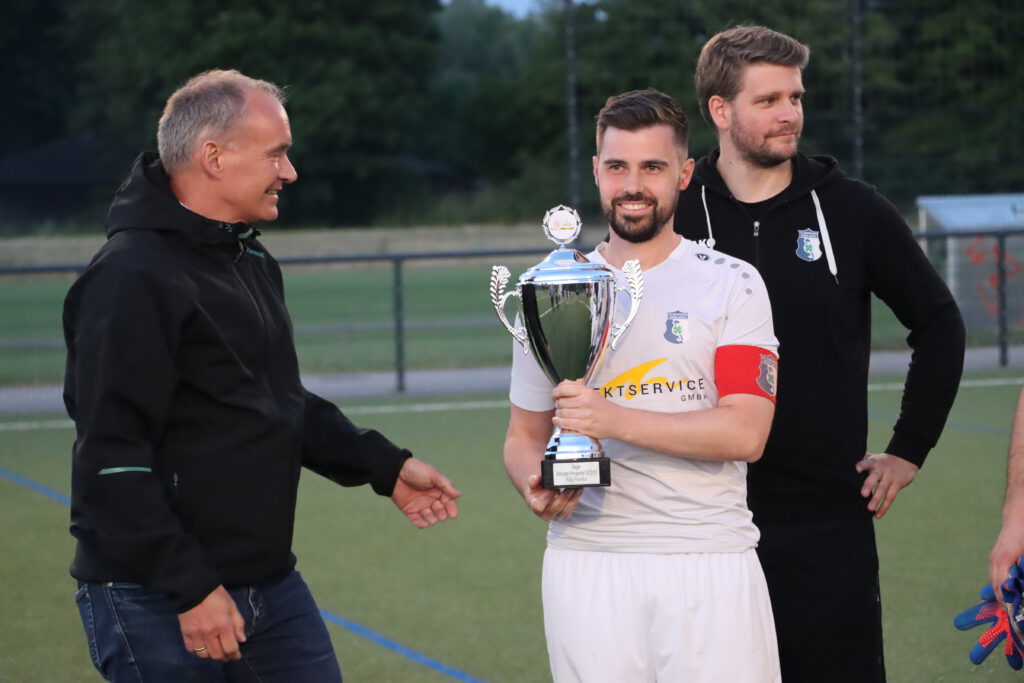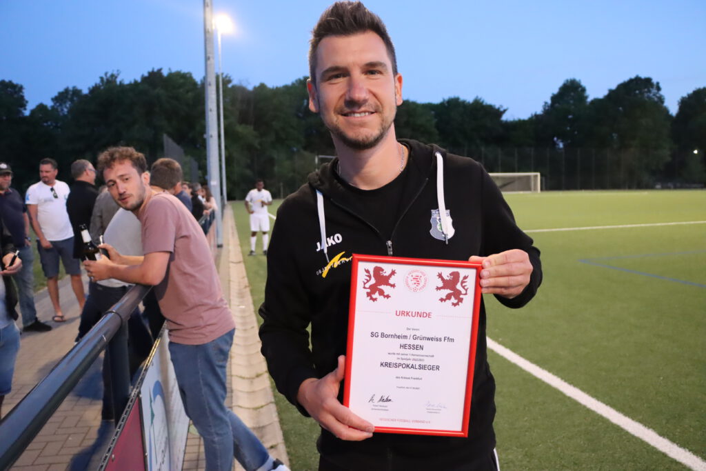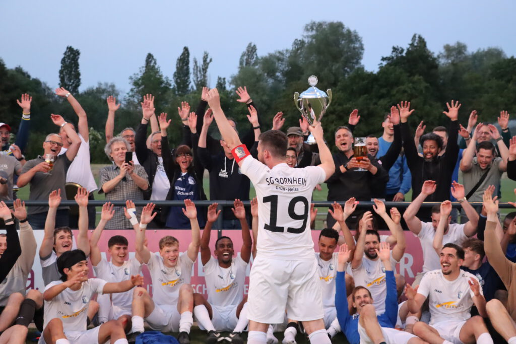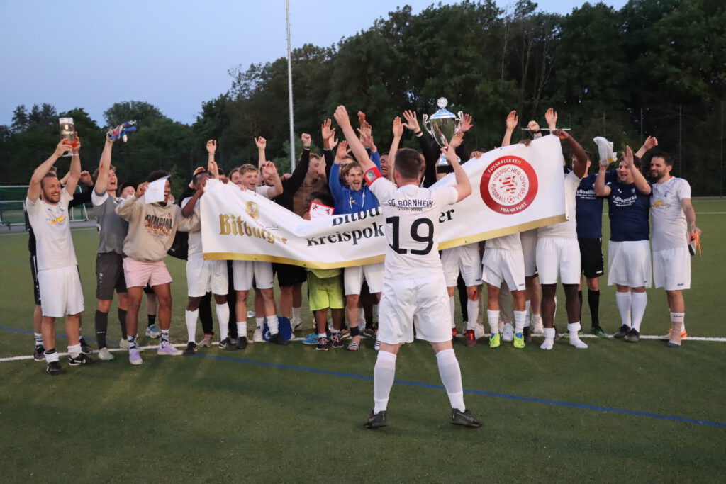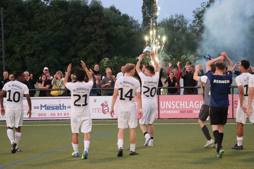 Raphael Gure erkämpfte sich den Ball und steckte durch in den Lauf von Tewelde, der aus 18 Metern über 05-Torwart Leon Josipovic chippte (78.). Dann schickte Tewelde Kim steil, der den mit gelaufenen Tewelde sah. Mit einem erneuten Heber war die Sache mit dem 5:1 nun eindeutig (81.). Der Triumph wurde von den mitgereisten Anhängern der SG Bornheim/Grün-Weiß gebührend mit einigem Pyromaterial gefeiert. Der erneute Einzug in den lukrativen Hessen-Pokal sorgte für großen Enthusiasmus bei den Bornheimer Fans. Trainer Sascha Volk zeigte sich im Rahmen der Feierlichkeiten nach der Pokalübergabe ebenfalls begeistert: „Das ist überragend und genau das, was wir jetzt gebraucht haben. Dieses positive Erlebnis und die gute Stimmung nehmen wir für Sonntag mit.“ Für die entscheidende Verbandsliga-Begegnung bei Hessenliga-Absteiger FV Bad Vilbel, der als Teilnehmer an der Abstiegsrelegation mit dem Vizemeister der Gruppenliga Darmstadt feststeht, bangt Volk um den Einsatz der beim Endspiel verletzt ausgeschiedenen Aljoscha Richter und Niklas Troll. „Wir haben gegen Oberrad nach dem Rückstand geduldig weiter gespielt und uns neben den fünf Toren noch viele gute Möglichkeiten herausgespielt und nicht mehr viel zugelassen“, analysierte der Bornheimer Coach und ergänzte: „Wir sind megastolz auf die Truppe, dass sie zum Ende der Saison so eine Energieleistung gezeigt hat.“