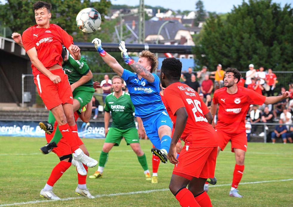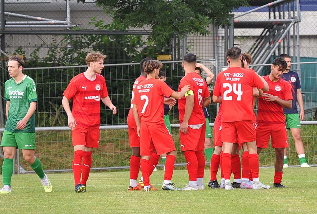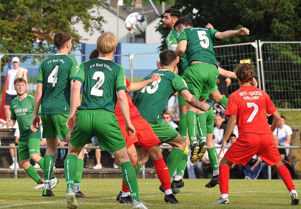 Leider aber Verletzungen auf Seiten der Hausherren, die Denis Hadzimusic nach einem harten Zweikampf als Ausfall zu beklagen hatten und dafür den reaktivierten Routinier Jonas Grüter brachten. Kurz vor der Pause erlitt auch Philipp Schaal eine Kopfverletzung, konnte aber dann doch noch bis Minute 70 mit einem Kopfverband weiter spielen. In Führung ging Walldorf II dann wenige Minuten nach dem Seitenwechsel und dieser Treffer war umstritten. Ein Heber des zum Kader der Ersten Mannschaft zählenden Ilias Benazza war auf dem Weg ins Vilbeler Tor, es vollendete aber Can Karakas per Kopf aus stark abseitsverdächtiger Position. Die nachfolgenden Reklamationen von FV-Trainer Roland Stipp beim Schiedsrichter brachten nichts ein, das Tor zählte (51.). Doch nun ging ein Ruck durch das Vilbeler Team. Ganz wichtig war die Präsenz von Torjäger Flakron Thaci, der nur sechs Minuten später aus halbrechter Position kommend zum 1:1 einschoss (57.). Bad Vilbel erhöhte nun den Druck und belagerte das Tor von RWW-Keeper Jannik Treber, der Chancen der Gastgeber durch Niklas Kraus, Masahito Morishima und Thaci vereitelte.