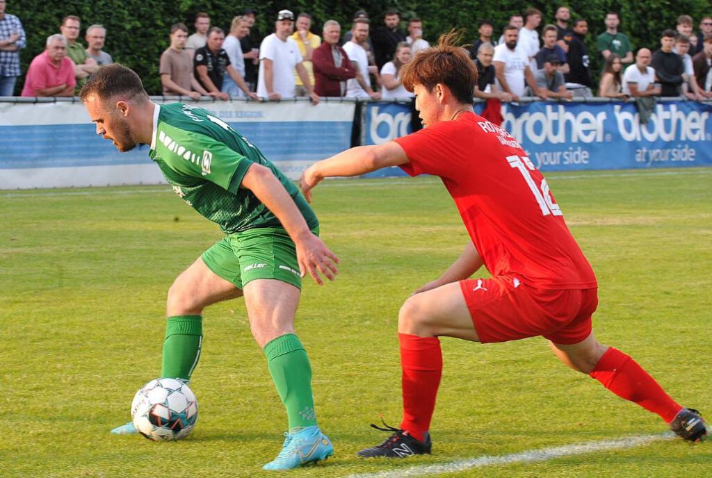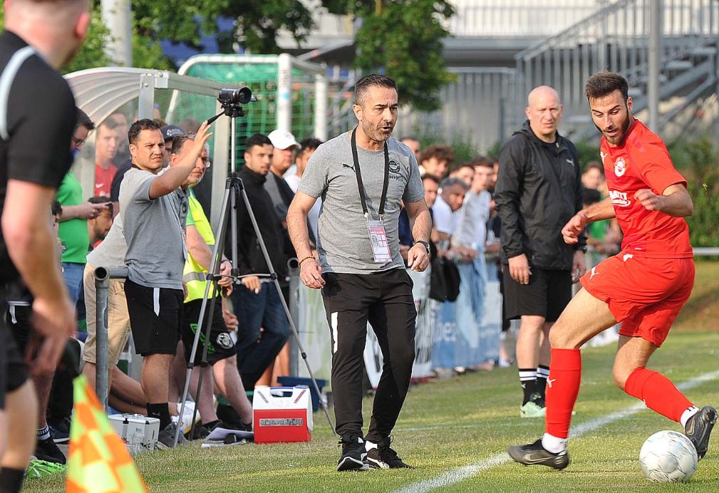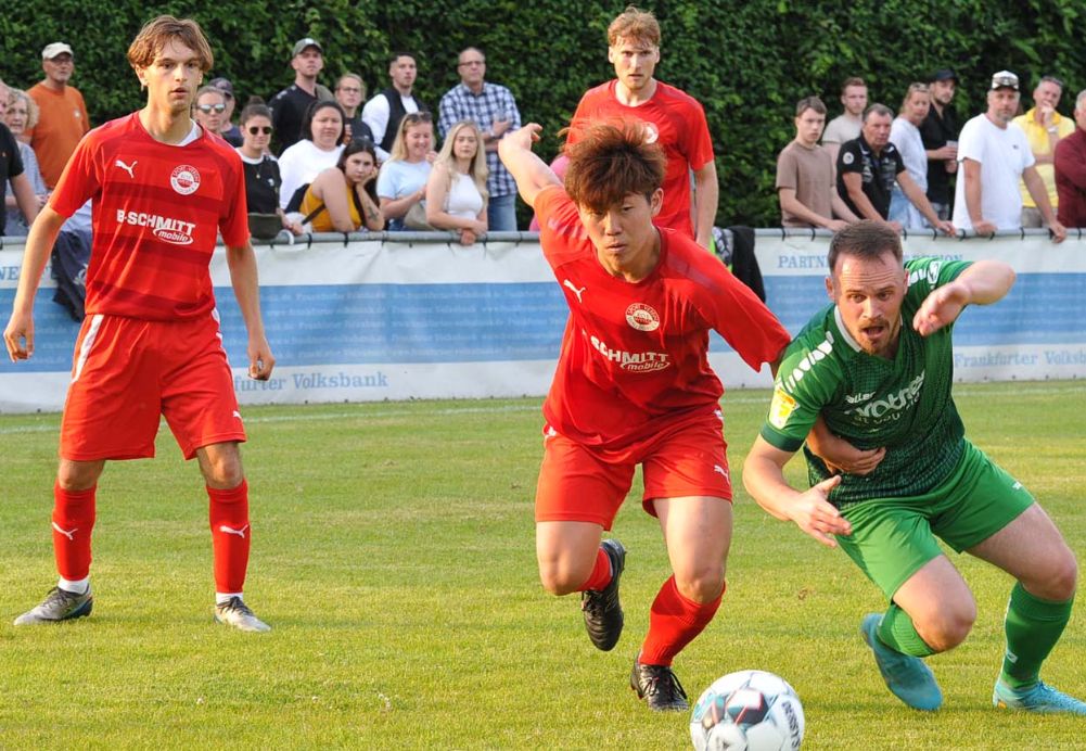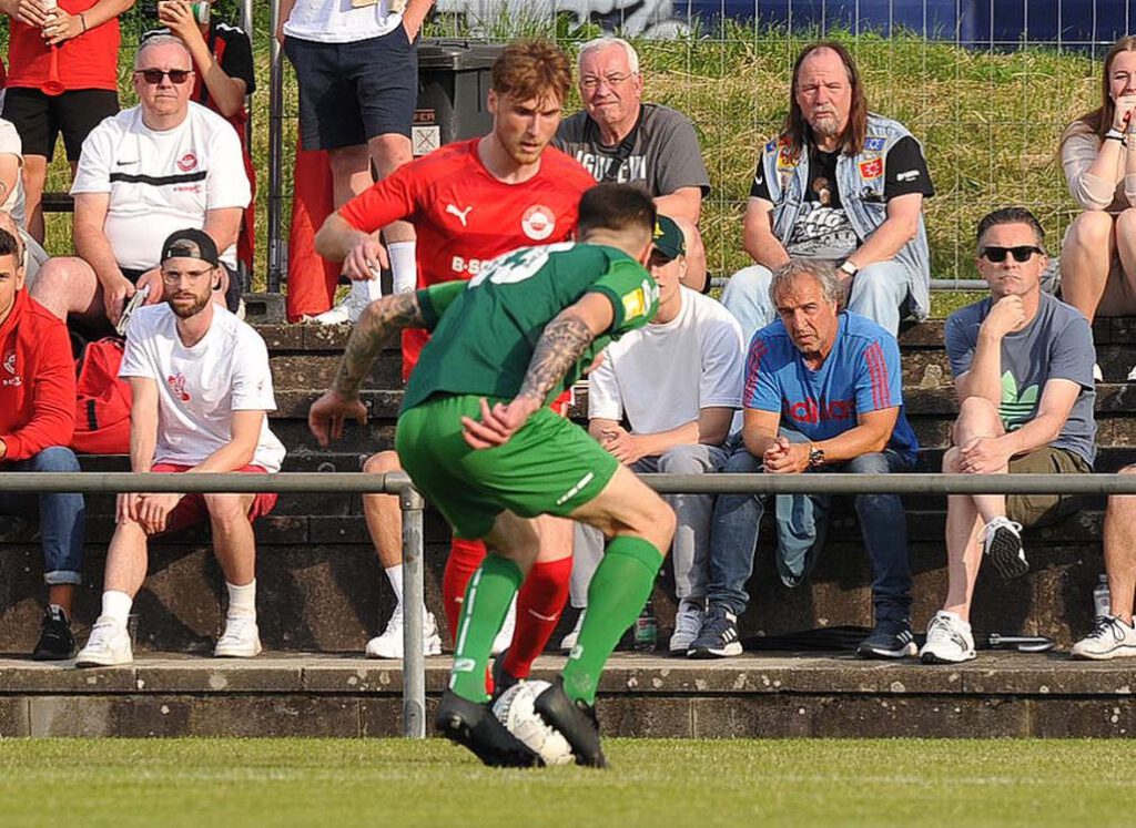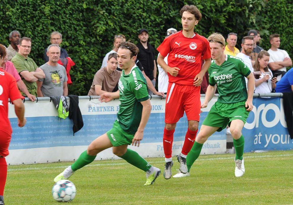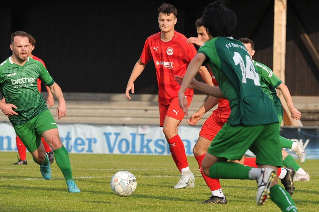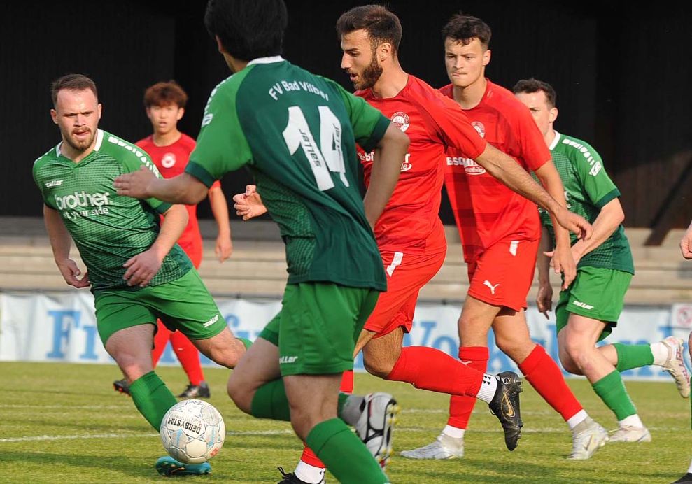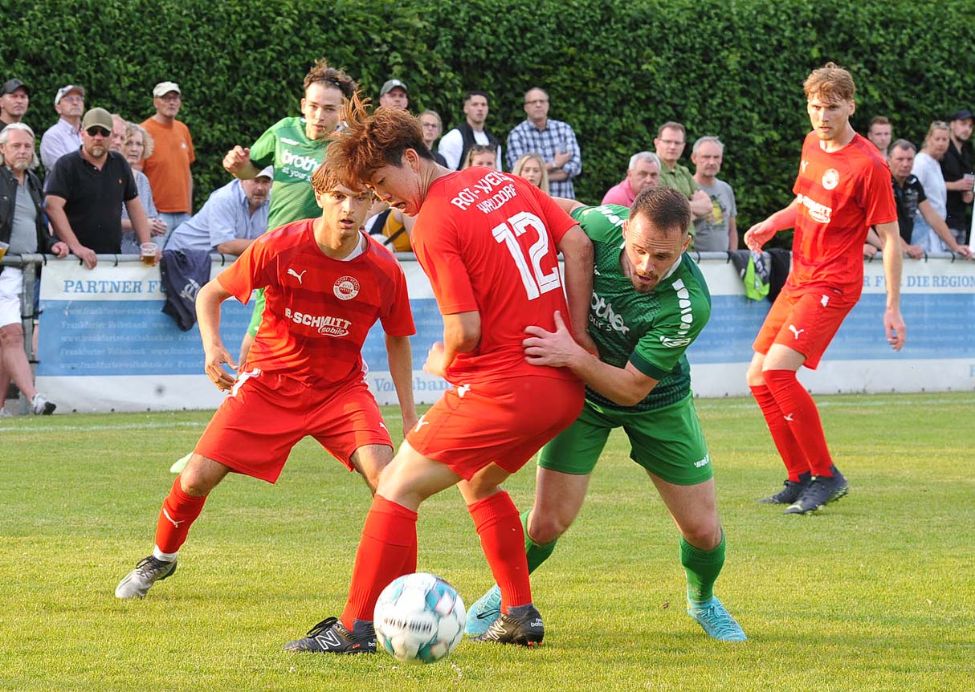 Diesmal füllten den Platz nicht nur heimische Zuschauer, sondern auch viele neutrale Besucher, die zuvor beim 5:0 der SG Bornheim gegen Viktoria Bronnzell in der Hessenliga-Relegation waren und die späte Anstoßzeit in Bad Vilbel (19 Uhr) für einen „Doppler“ nutzten. Aber auch die Walldorfer Gäste hatten erstaunlich viele Anhänger mitgebracht. Relegation zieht und so durften die exakt 453 erschienenen Fußball-Freunde einer spannenden Begegnung beiwohnen. Bei den Gastgebern hatte sich die Personallage im Vergleich zum letzten Ligaspiel gegen Bornheim (0:1) leicht entspannt, dennoch lief mit dem 20-jährigen Benedikt Macker ein Akteur aus der in der A-Liga spielenden Zweiten Mannschaft von Beginn auf. Die sehr enge Partie offenbarte vor allem den Kampfgeist der Vilbeler Truppe. Sie warfen sich in jeden Zweikampf und gaben keinen Ball vor der Seitenlinie verloren. Die technisch etwas versierteren Gäste machten die Räume vor den Augen des langjährigen Vilbeler Trainers Amir Mustafic, der sich in den gut besetzten Walldorfer Fanblock „eingeschlichen“ hatte, aber voll mit seinem Ex-Team mitging, geschickt eng, sodass es im ersten Abschnitt keine glasklaren Torchancen zu verzeichnen gab.