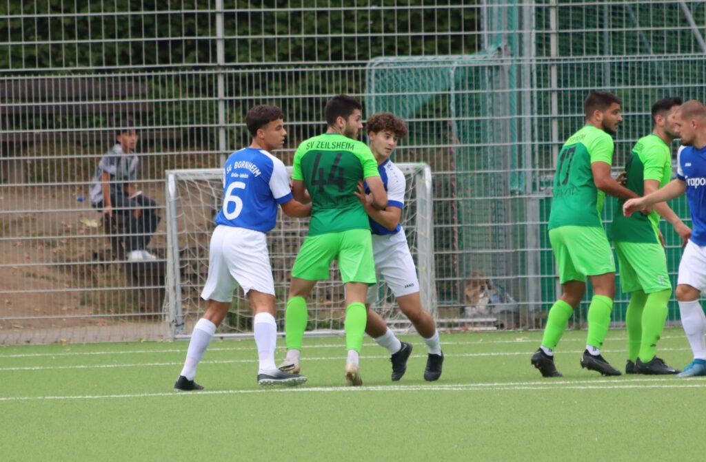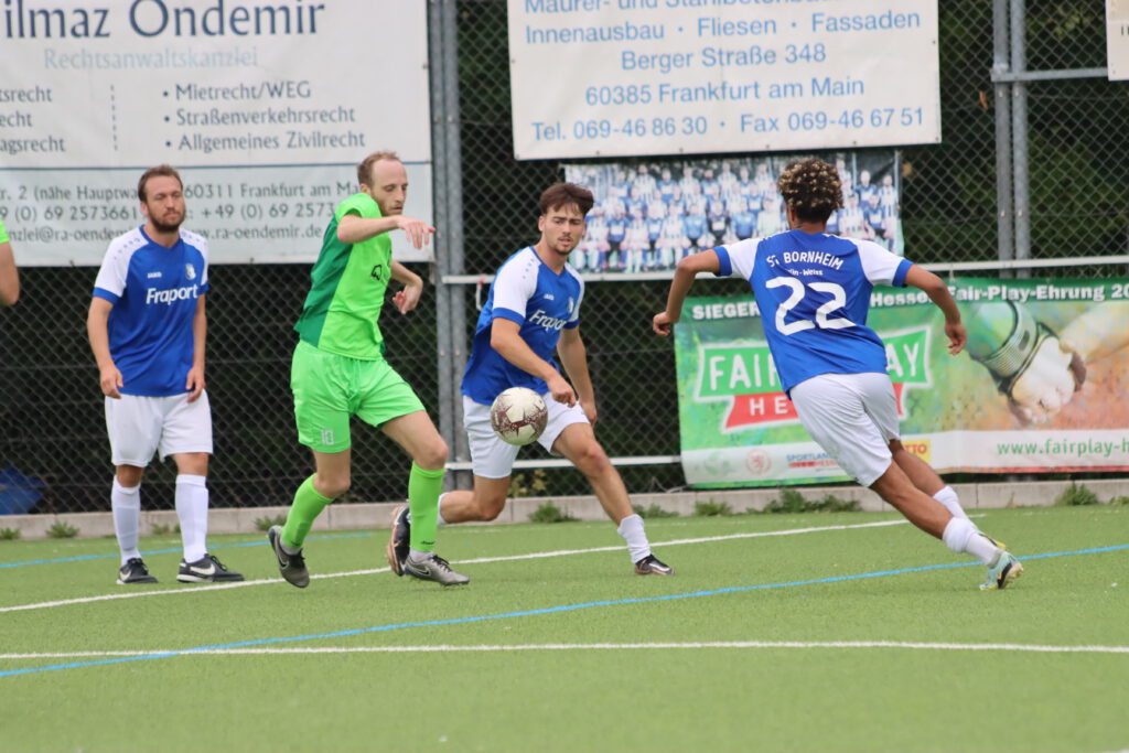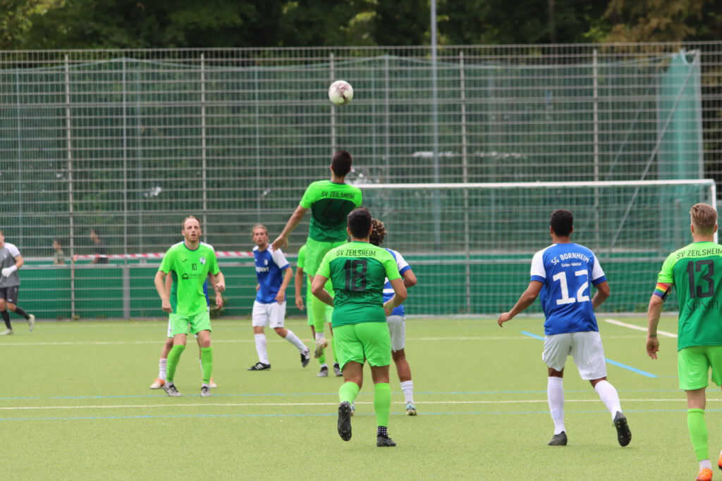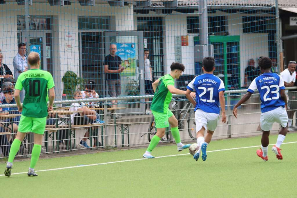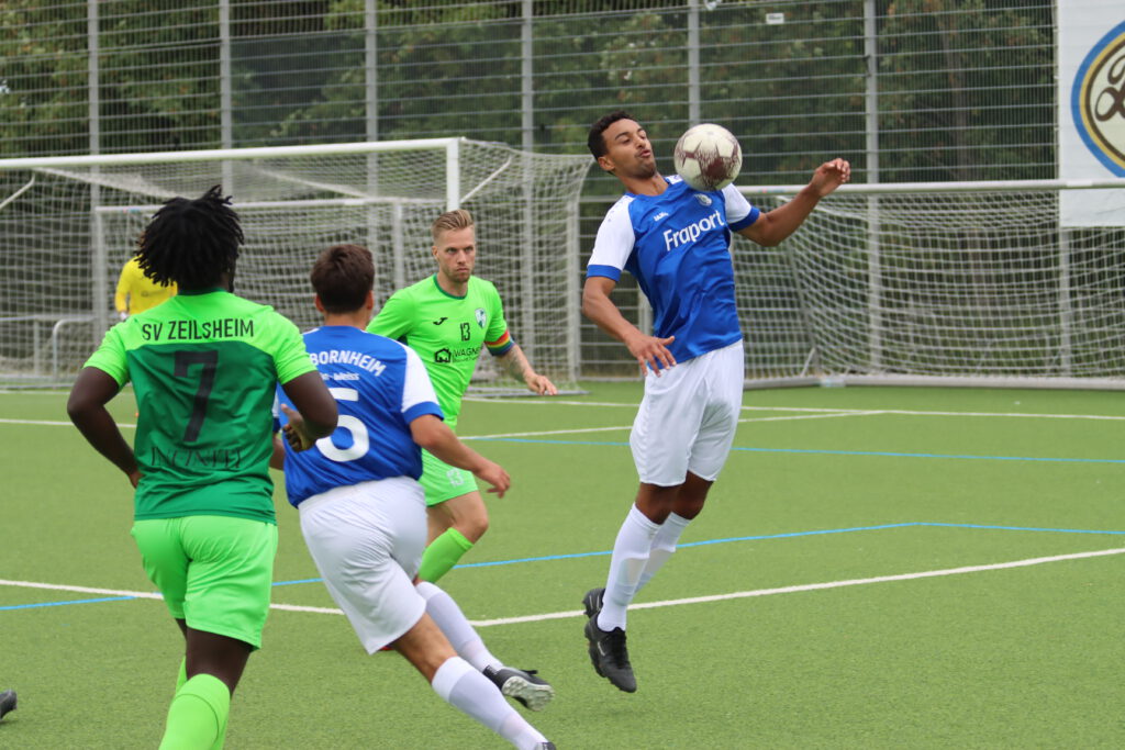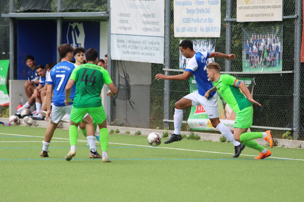Die Zeilsheimer haben sich mit einigen erfahrenen Akteuren vom Hessenligisten Rot-Weiß Walldorf verstärkt. Einer dieser Spieler, Laurin Vogt, brachte die Gäste zu Beginn schon in Führung (2.). Nach dem 1:1 durch Mohemedelamin Camara (27.) unterlief Vogt nach einem Freistoß von Mahmut Afsar ein Eigentor zur Bornheimer Führung (32.). Seinen Fehler machte Vogt dann aber mit dem Ausgleich wieder gut (39.).