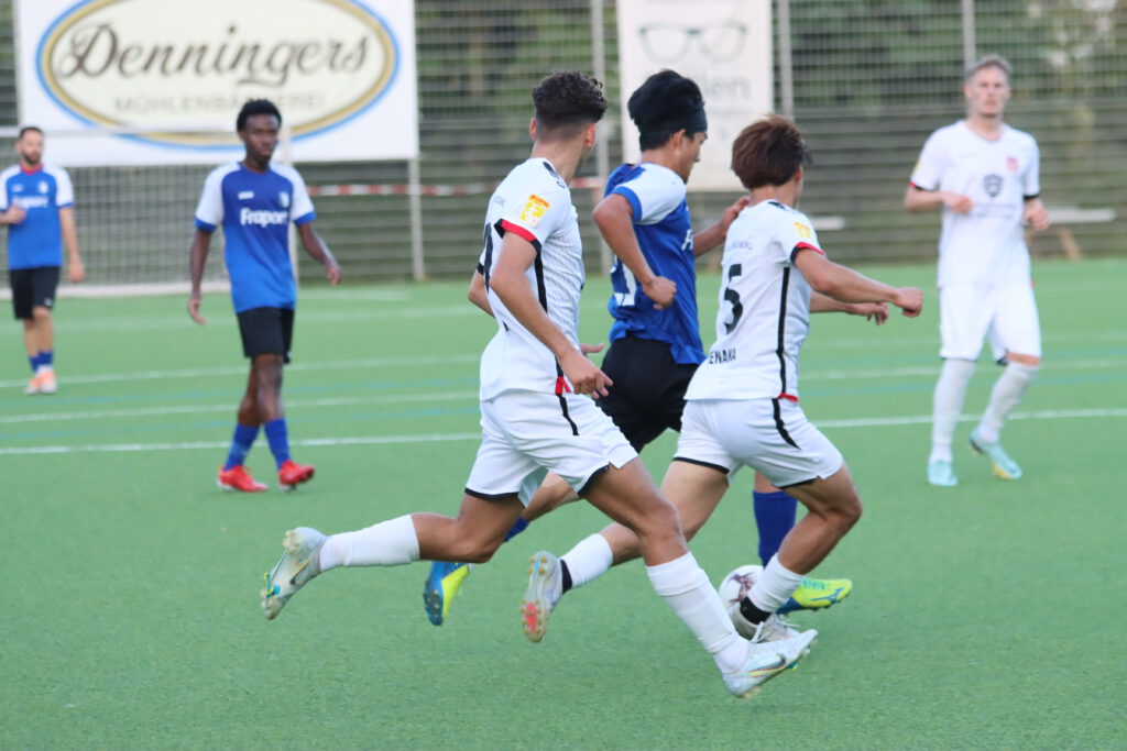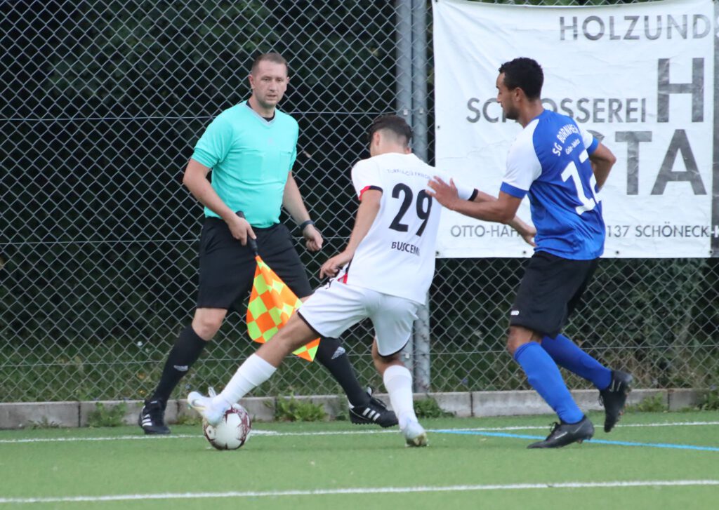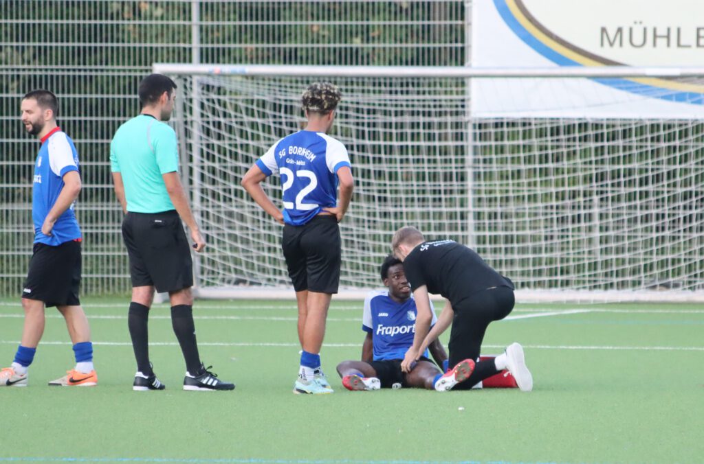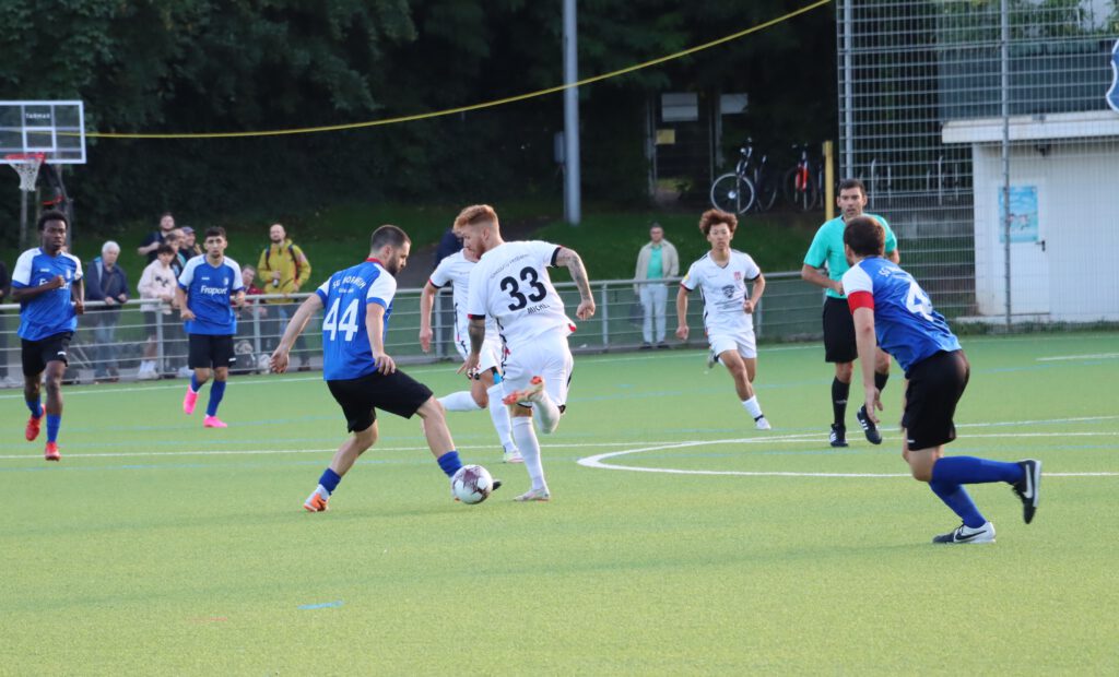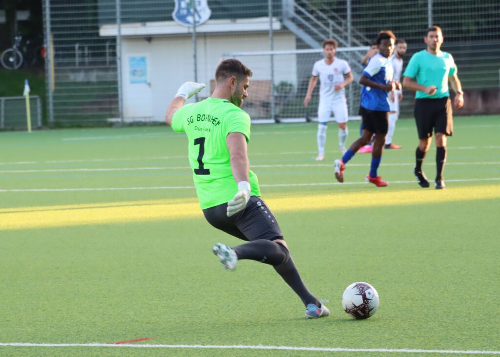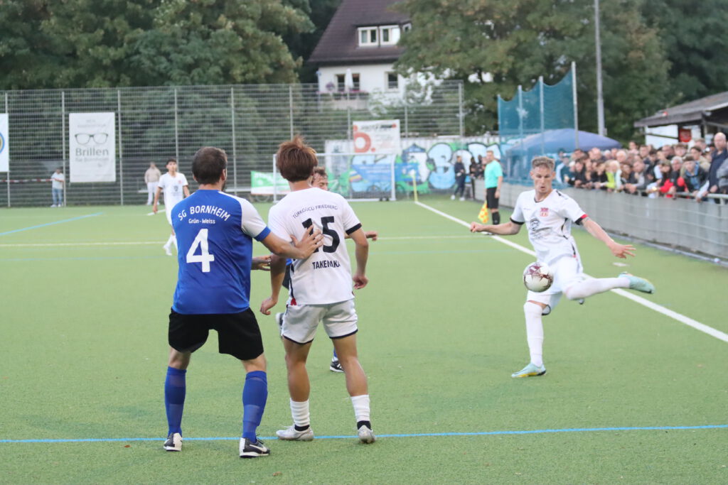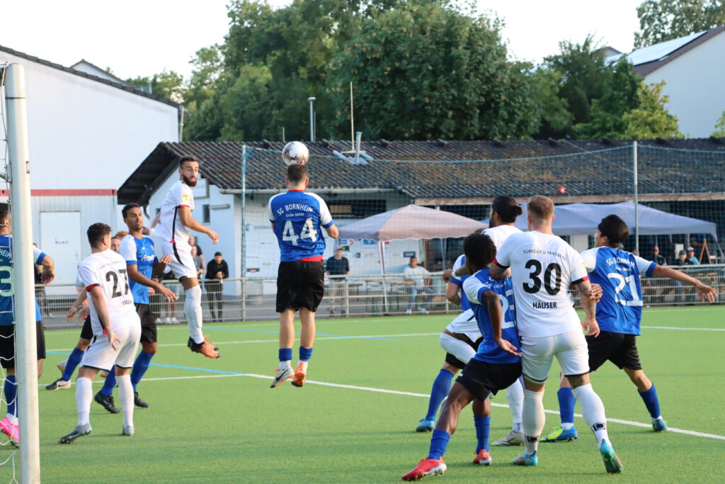 In den ersten 20 Minuten kam der Hessenligist aus Friedberg überhaupt nicht ins Spiel, er agierte spielerisch zwar ansehnlich, aber nach vorne lief nicht viel, die Fünferkette in der Bornheimer Verteidigung, die bei eigenen Angriffen zur Dreierkette wurde, konnte alles wegverteidigen. Im Gegenteil, die Bornheimer kamen immer wieder durch Gegenstöße zu gefährlichen Szenen, in der 5.Minute ging ein Kopfball von Raphael Ahmed Gure knapp über das Tor und in der 12.Minute scheiterte Mahmut Afsar am generischen Torwart. In der Folgezeit spielte sich alles zwischen den Strafräumen ab, in der 40.Minute mussten die ohnehin durch Verletzung dezimierten Bornheimer einen weiteren Rückschlag erleiden, Benny Christian Laporte wurde verletzungsbedingt durch Timon Rosenkötter ersetzt. In der 45.Minute dann die größte Chance des Spiels für Türk Gücü, nach einem Flankenball und einem Rückpass kam Noah Michel aus 10 Metern zum Schuss, den Torwart Gianluca Colombo mit einem Reflex abwehren konnte, auch den Nachschuss von Fabio Buscemi aus zwei Metern konnte der Torwart entschärfen. So ging es mit einem leistungsgerechten 0:0 in die Pause. Ein Klassenunterschied war nicht zu erkennen.