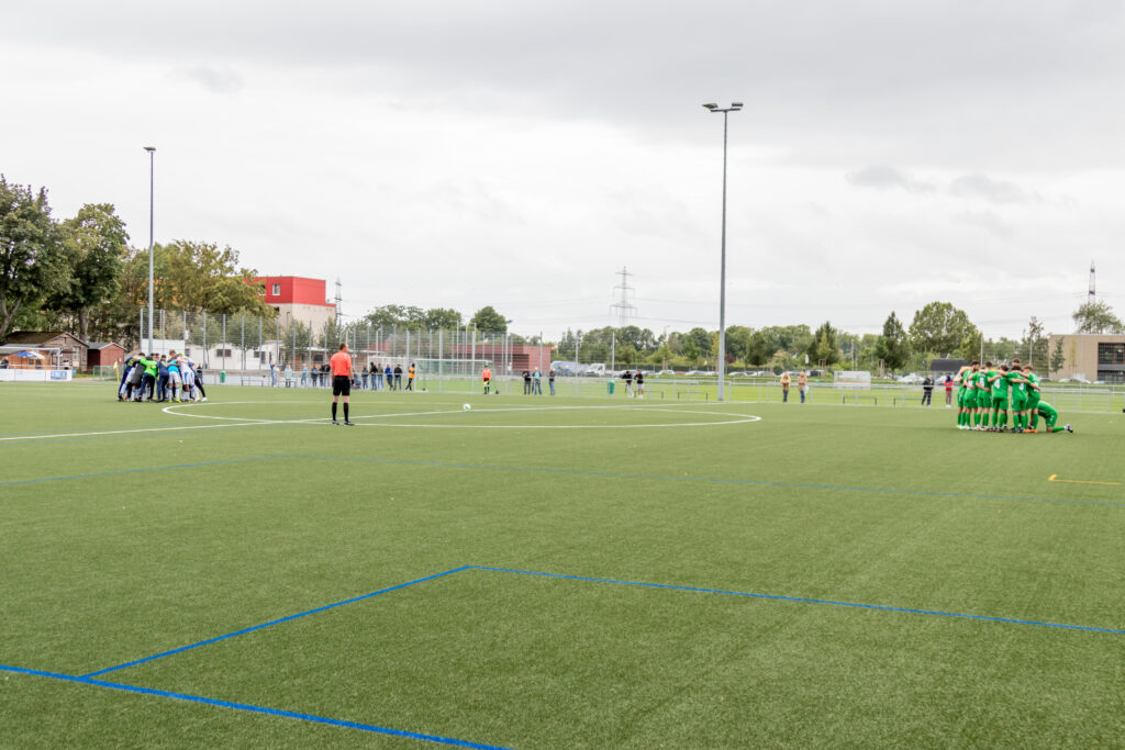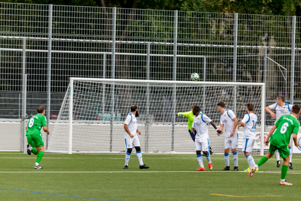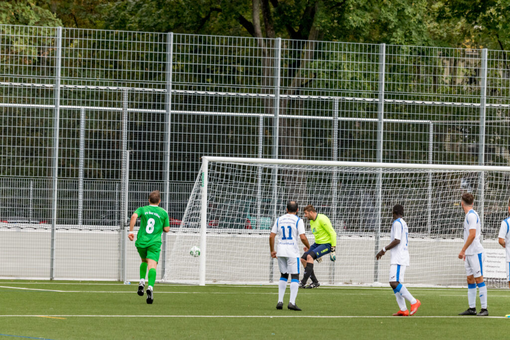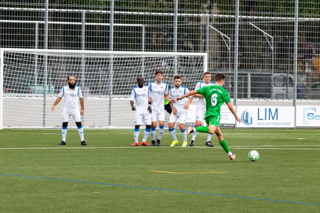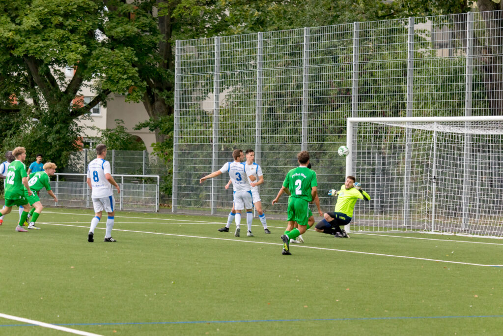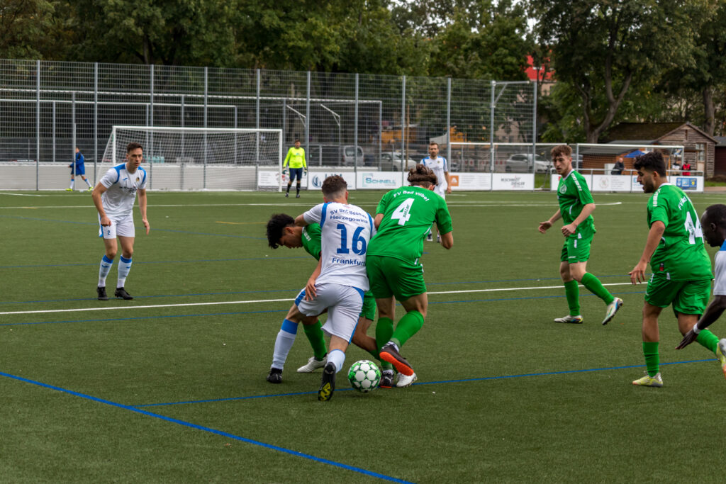 Dauerregen in Frankfurt hielt sicherlich einige Zuschauer vom Besuch zur Saisoneröffnung für den SV BKC Bosnien ab, und sie verpassten so einiges. Die Bosnier übernahmen sofort die Spielführung und erzielten bereits in der 2.Minute das 1:0 durch Secouba Diatta. Die runderneuerte junge Bad Vilbeler Mannschaft schlug aber in der 19.Minute durch Malik Makey zurück, der den Ausgleich zum 1.1 erzielte. Nur 6 Minuten später erhöhte Elvedin Jasic zum 2:1 für den BKC, und bis zur Pause ließen die Gastgeber noch einige Chancen liegen. So ging es mit dem knappen Ergebnis in die Pause.