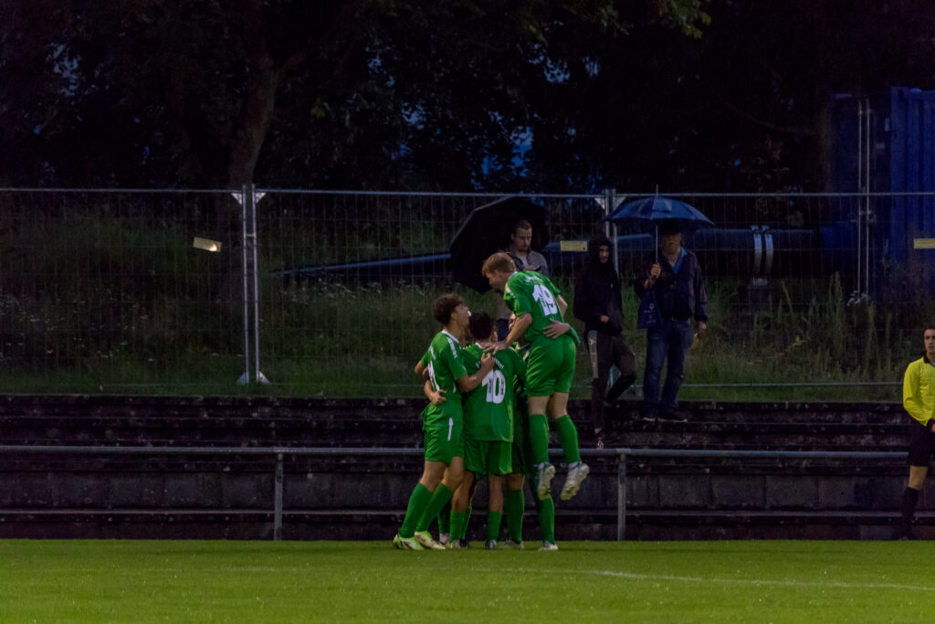 Die FG Seckbach wollte den Bock umstoßen und nach drei sieglosen Spielen wieder dreifach punkten, doch der FV Bad Vilbel hielt dagegen und es entwickelte sich ein kampfbetontes Spiel auf einem durch den Dauerregen schwierigen Geläuf. Der FV Bad Vilbel kam besser ins Spiel und dominierte die erste Viertelstunde, kam dann auch in der 12.Minute zur nicht unverdienten Führung. Ein Distanzschuss von Malik Makey, auf dem nassen Untergrund immer ein probates Mittel, schlug zum 1:0 für den FV im Tor der Seckbacher ein. Danach nahm die FG Seckbach das Spiel in die Hand, hatte nach Aussagen von, Spielausschuss-Vorsitzenden Jo Nareike „die bessere Spielanlage und 5, 6 dicke Chancen“. Bis zur Halbzeit blieb es aber beim Ergebnis von 1:0.