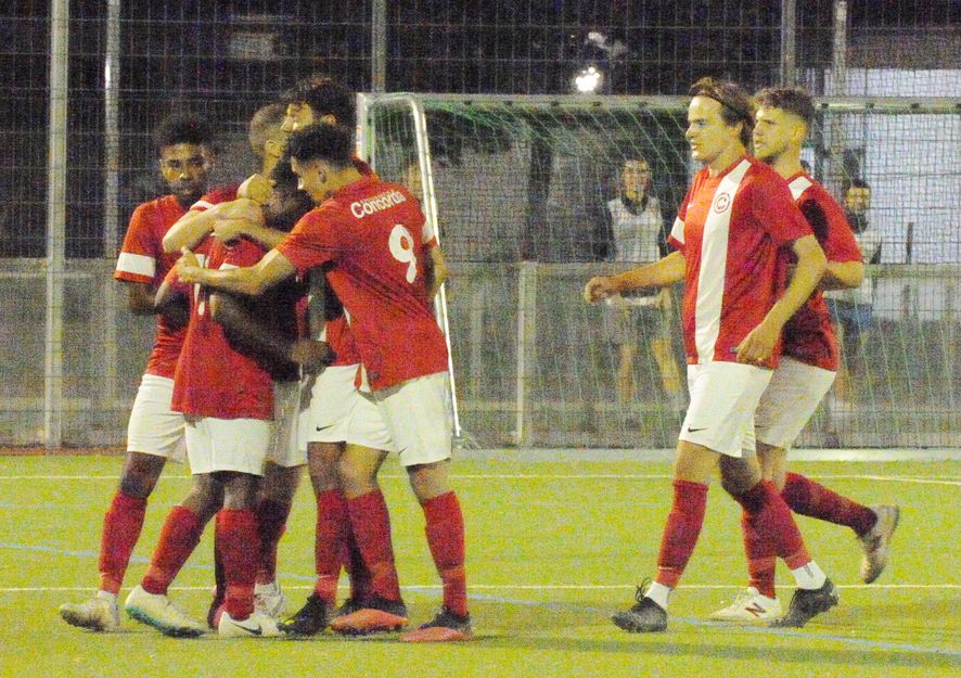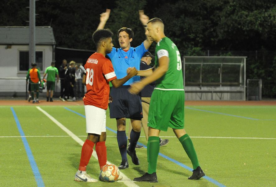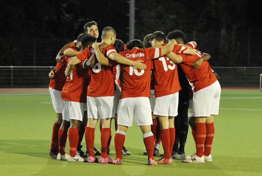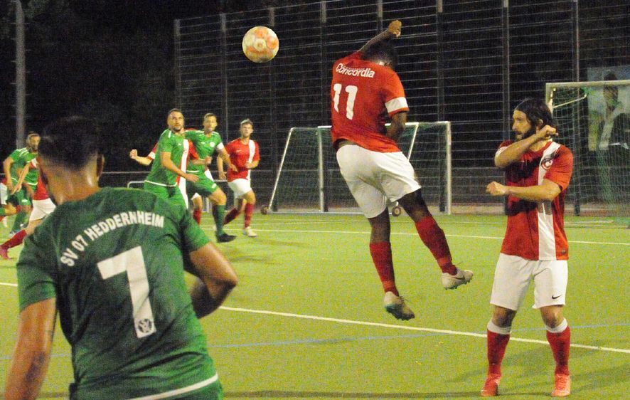 Kurz vor Spielbeginn war das Flutlicht noch schwach, dann erstrahlte es aber im vollen Glanz und es konnte los gehen. Die Gastgeber mussten ungewohnterweise in Rot-Weiß spielen, da Heddernheim ganz in grün auflief. Es ging auch gut los für das Team von der anderen Niddaseite, denn nach einem Freistoß köpfte Serdar Birhimeoglu auf das Tor. Heimtormann Nick Gutschmidt ließ abklatschen und Marcus Kreckel, der neue Offensivmann, staubte zur Gästeführung ab (2.). In der Folge gab es noch weitere Abschlüsse durch Yassir Achati und Oliver Solarz, dessen Schuss Gutschmidt zur Ecke abwehrte. Dann aber kam auch die Concordia ins Spiel, die auf den krankgemeldeten Trainer Andreas Ludwig verzichten musste. Der ehemalige Heddernheimer Trainer und Spieler wurde von Co-Trainer Florian Schoch an der Seitenlinie vertreten. Nach einer Ecke von der rechten Seite nahm Jordy Kambandje Elavoko den Ball von der Strafraumkante direkt und überwand Marcin Czukiewicz, der nach seinem „Rücktritt vom Rücktritt“ wieder für den angeschlagenen Marc Tomczyk im Tor stand (18.). Die Gastgeber setzten nach und gingen mit Diogo Jesus de Oliveira sogar in Führung (25.).