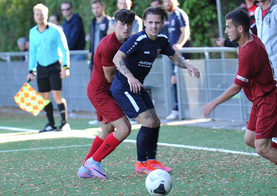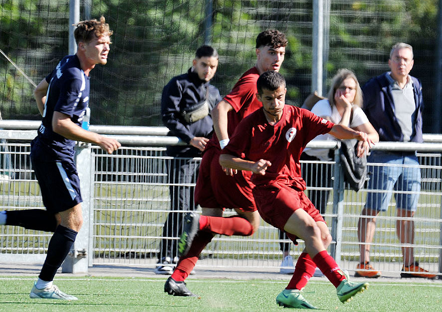 In den Rödelheimer Parkweg reiste der unangefochtene Tabellenführer SV Unter-Flockenbach, mit sieben Siegen und einem Remis erfolgreich in die Saison gestartet, die Gastgeber von RW Frankfurt mit nur einem Sieg aus 8 Spielen standen auf Tabellenplatz 15, da waren die Rollen klar verteilt. Und das Spiel begann eigentlich wie erwartet. In der 2.Minute ließ RW-Torwart Bennet Karrer einen Ball nach vorne abprallen und per Abstauber erzielte Lotfi Graidia die frühe Führung für den Favoriten. Doch die gut eingestellte Mannschaft der Gastgeber ließ sich nicht beirren und es entwickelte sich in der Folgezeit ein rassiges Spiel zweier guter Mannschaften. Bereits in der 4.Minute kamen die Rot-Weissen zum Ausgleich, nach einem Schuss von der rechten Seite parierte SVU-Torwart Arthur Kovis den Ball zwar, aber den Abpraller schob Erolind Rudari zum schnellen 1:1 ins Tor. Und in der 12.Minute erhielten die Gastgeber einen Foulelfmeter, den Filip Cirpaci zur 2:1-Führung verwandelte.