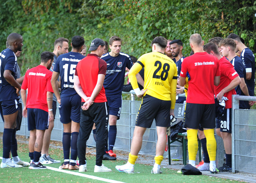 Die Rot-Weissen hielten gegen die spielerisch überlegenen Gäste kämpferisch dagegen und sorgten immer wieder durch schnelle Vorstöße für Verwirrung in der Abwehr des SV Unter-Flockenbach. In der 29.Minute fiel der Ausgleich für die Gäste, nach einem Pass in die Spitze kam es zu einem Pressschlag zwischen SVU-Stürmer Linus Hebling und dem herausgelaufenen Torwart Bennet Karrer, der Ball sprang wieder Hebling vor die Füße, der den Ball ins leere Tor einschieben konnte. Mit dem 2:2 ging es in die Kabinen.