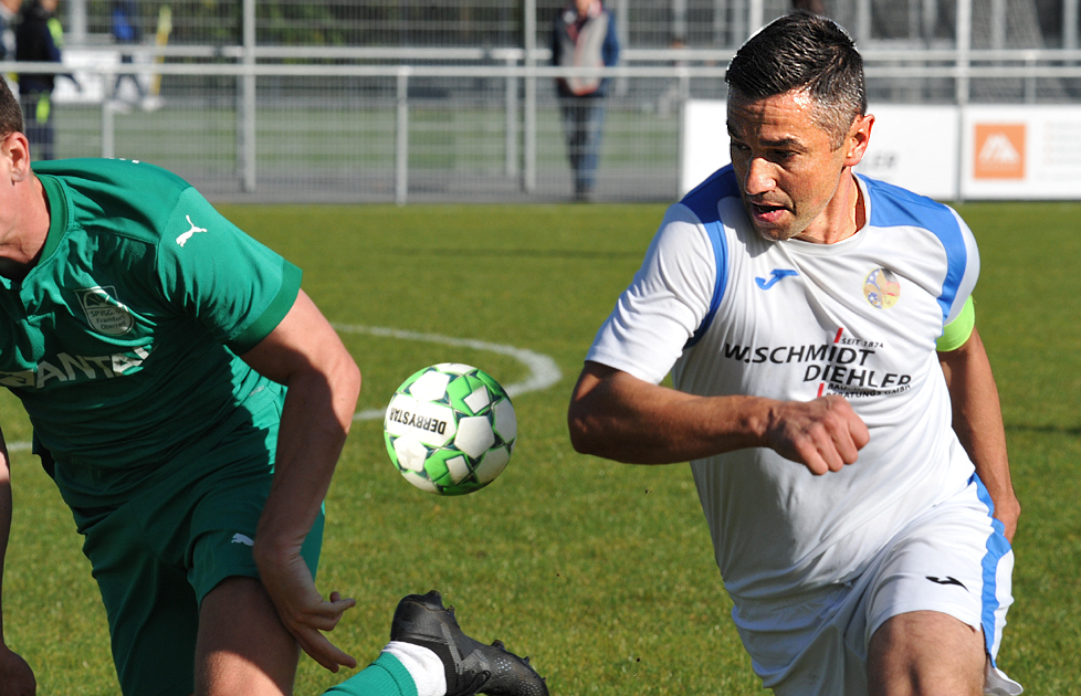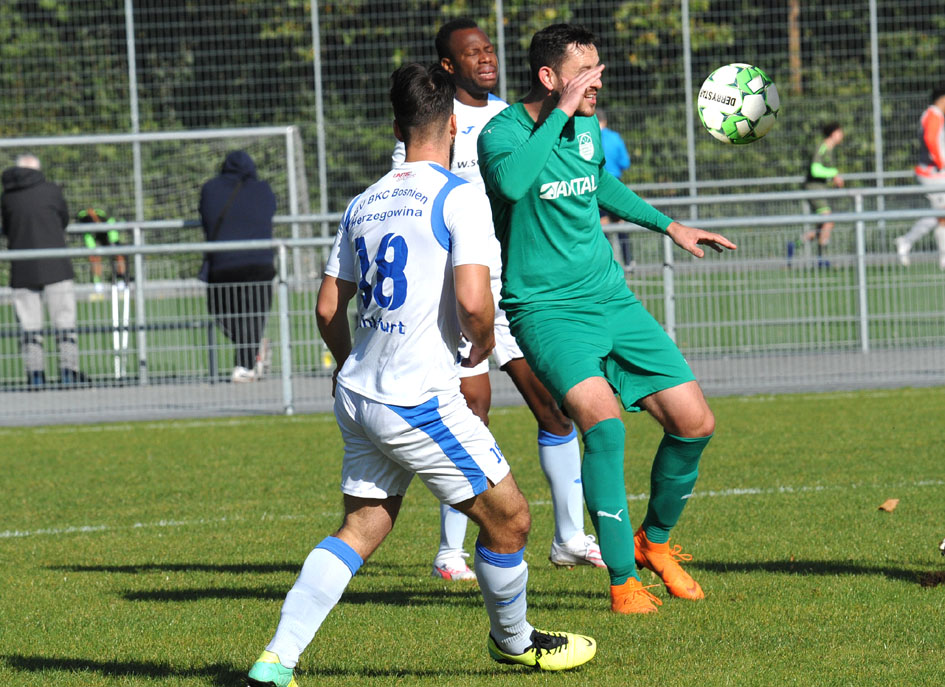 Derbyzeit an der Ackermannwiese, der SV BKC Bosnien empfing die in der Tabelle drei Plätze und drei Punkte besser positionierte Spvgg. 05 Oberrad, und das Spiel war auch im Verlauf auf Augenhöhe. Die Oberräder hatten am Anfang Probleme, sich an den großen und tiefen Rasenplatz zu gewöhnen, und so kamen die Bosnier besser ins Spiel, auch weil sie in den Zweikämpfen bissiger wirkten. Bereits in der 8.Minute musste Oberrads Torhüter Filip Stojikovic bei einem Schuss von Safet Mujkic eingreifen, auf der Gegenseite war es in der 18.Minute Julian Baumann, der nach einer Kopfballverlängerung von Masse Bell Bell freistehend über das Tor köpfte. Lange Bälle von den Oberrädern wurden eine leichte Beute der groß gewachsenen Abwehrspieler der Bosnier, die in der 24.Minute eine weitere große Chance verpassten, Dejan Misic schoss knapp am langen Pfosten vorbei.
