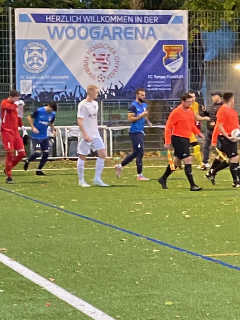 In der Woogarena im Ginnheimer Wäldchen trafen am Samstag Abend unter Flutlicht zwei Mannschaften an, die den Kontakt zur Tabellenspitze nicht verlieren wollten. Dabei standen die Gäste aus Karben nur einen Punkt besser als der FC Tempo. In der ersten Halbzeit entwickelte sich dann auch ein Spiel auf Augenhöhe, das sehr taktisch geprägt war und nicht viele Torchancen hergab. Die ersten Chancen hatte der FC Karben, in der 17.Minute köpfte Christopher Pross den Ball nach einer Ecke aus 8 Metern freistehend über das Tor, in der 20.Minute schoss Axel Furkert aus guter Position den Ball an das Außennetz. Für den FC Tempo schoss Stevan Lukovic das Leder in der 30.Minute aus 16 Metern knapp am Tor vorbei, und in der 38.Minute wurde Sascha Gordanic freigespielt, doch bei seinem Schuss war gerade noch ein Abwehrbein der Karbener dazwischen. In der 45.Minute fiel dann aufgrund der Entstehung die überraschende Führung für die Gäste, nach einem Eckball gab es einen Aufschrei im Strafraum des FC Tempo und ein Karbener Spieler lag am Boden, der Schiedsrichter zeigte daraufhin etwas überraschend auf den Elfmeterpunkt. Owen Hare ließ sich die Chance nicht entgehen und verwandelte den Strafstoß zur 1:0-Halbzeitführung für die Gäste.