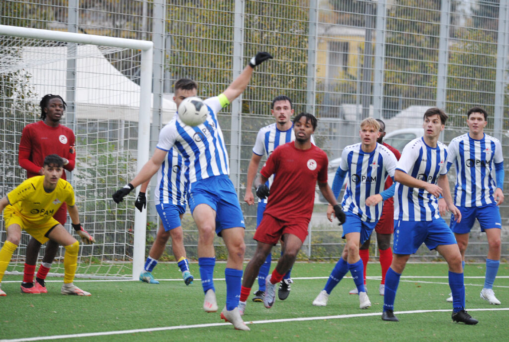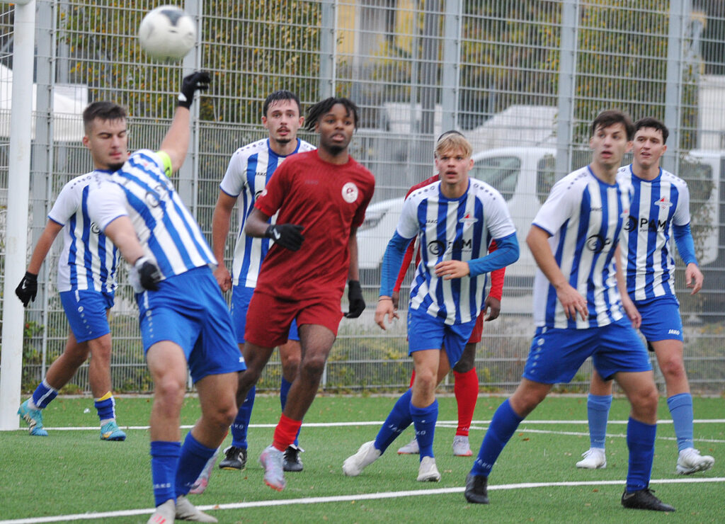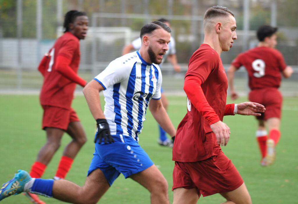 Die Rot-Weissen kamen im zweiten Spiel unter ihrem neuen Trainer Ibrahim Cigdem gut ins Spiel, konnten in der ersten halben Stunde aber offensiv keine großen Chancen herausspielen. Wie aus dem Nichts erzielten die Gäste aus Rodgau dann in der 30.Minute die 1:0-Führung, Adis Pasic traf nach einem Abwehrfehler der Gastgeber. Danach waren die Frankfurter von der Rolle und kamen mit dem hohen Pressing der Gäste nicht mehr klar, Elton Mensah in der 36.Minute und Petrit Hulaj in der 42.Minute erhöhten für Rodgau auf 3:0, und die Frankfurter hätten sich nicht beschweren dürfen, wenn der Rückstand zur Halbzeit noch um ein oder zwei Tore höher ausgefallen wäre.