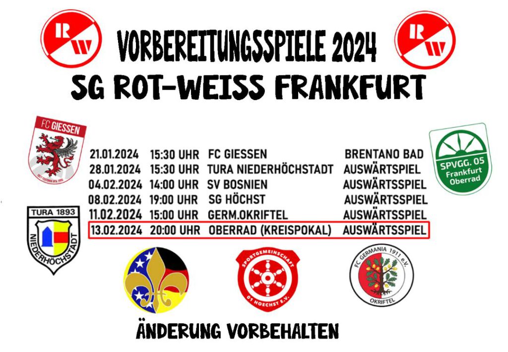 Am 8. Februar gastiert man bei der SG Hoechst mit Ex-Profi Sascha Amstätter als Trainer und am 11. Februar bei Germania Okriftel, beides Gruppenligisten aus der Staffel Wiesbaden. Das erste Pflichtspiel ist für den 13. Februar (20 Uhr) vorgesehen, wenn es beim Frankfurter West-Gruppenligisten Spvgg. 05 Oberrad im Kreispokal-Achtelfinale darum geht, möglichst die nächste Runde zu erreichen.