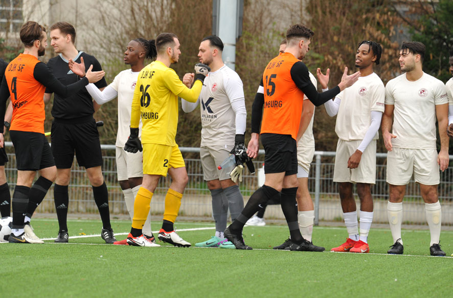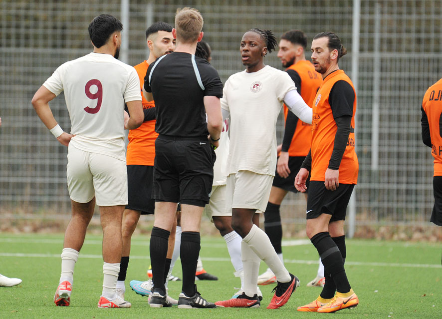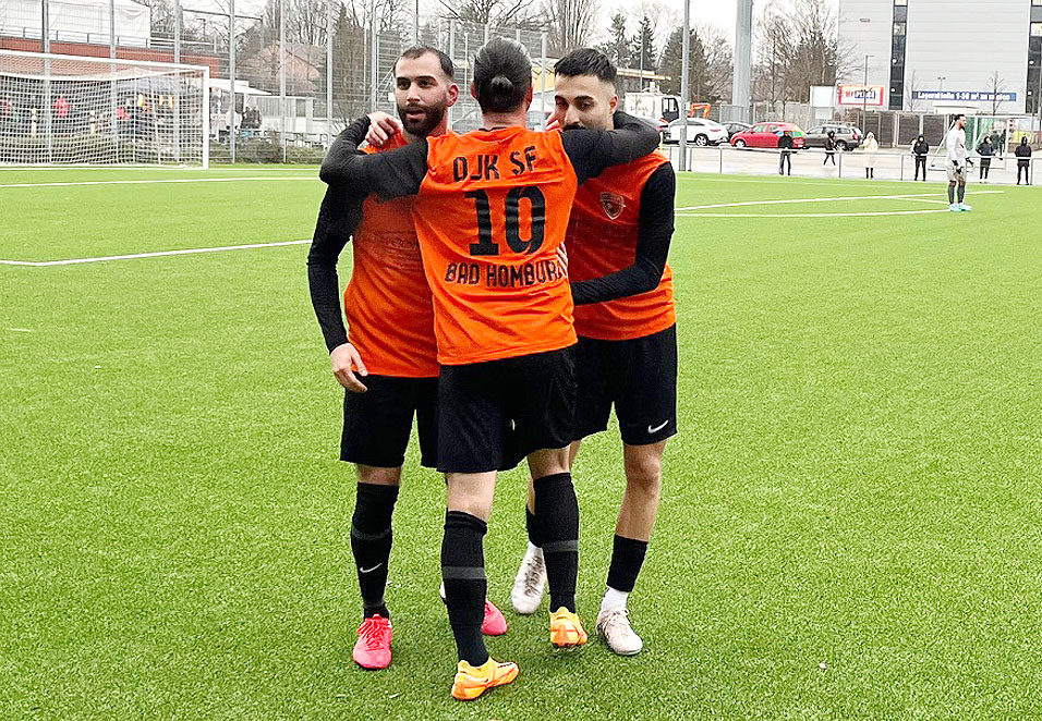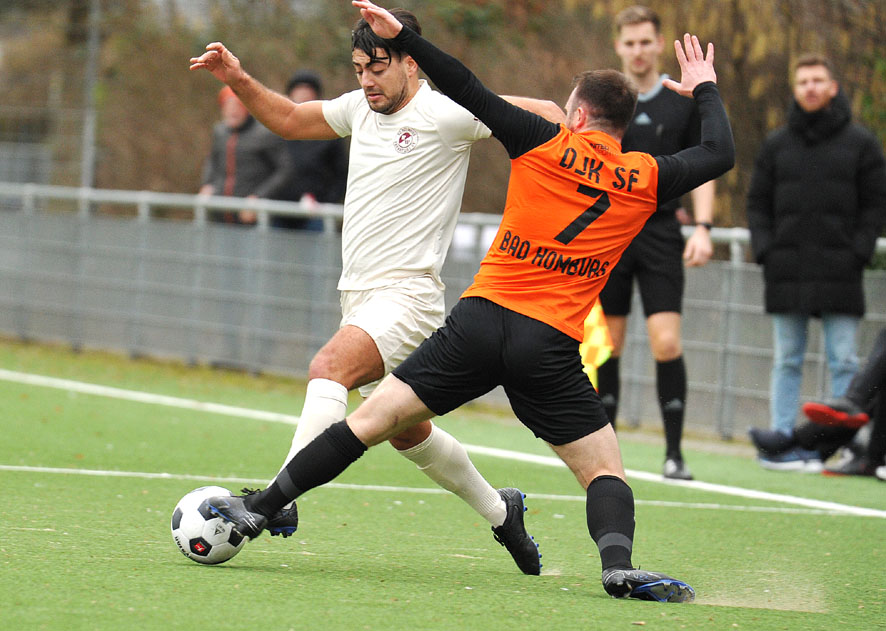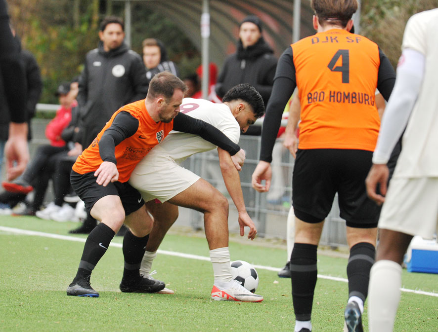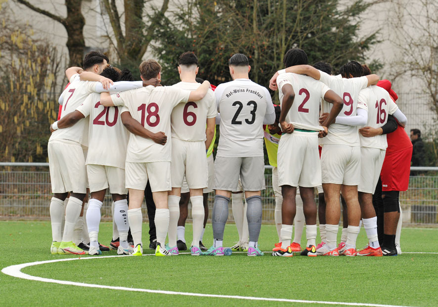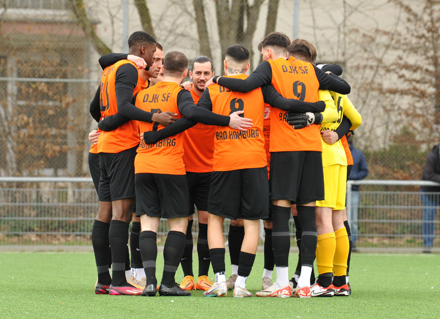 Rot-Weiss Frankfurt trat mit einer sehr jungen Mannschaft gegen den Favoriten aus Bad Homburg an, in der Startmannschaft standen drei Mann, die in der ersten Halbserie noch in der A-Jugend gespielt haben. Die DJK aus Bad Homburg wollten die Hinspielniederlage (0:4) vergessen machen. Allerdings waren es in den ersten 15 Minuten die auf einem Abstiegsplatz stehenden Rot-Weissen, die das Spiel bestimmten und mit frühem Pressing die Bad Homburger ein ums andere Mal in Verlegenheit brachten. Danach kamen die Gäste besser ins Spiel, es blieb aber bis zur Halbzeit ein Spiel auf Augenhöhe, die besseren Torchancen hatten allerdings die Sportfreunde, ohne aber zu 100-prozentigen Gelegenheiten zu kommen. So blieb es bis zur Pause beim leistungsgerechten 0:0.