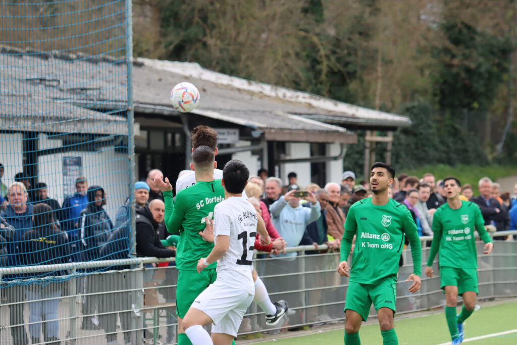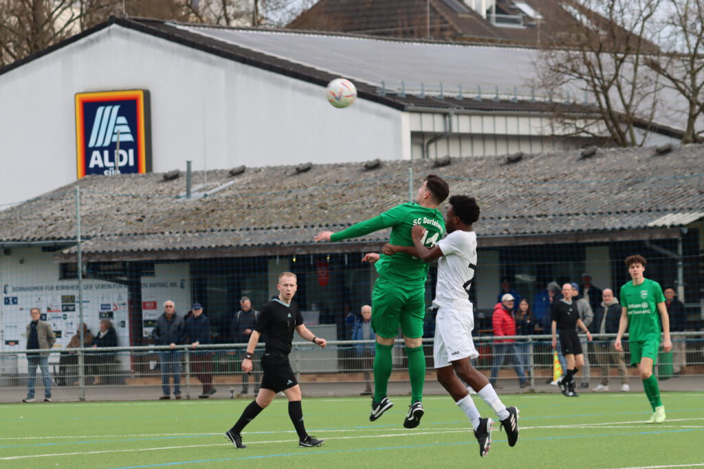 Bei der besten Gelegenheit der Bornheimer durch den Kopfball von Valerio Lettieri musste ein Dortelweiler auf der Torlinie klären. Mitte der ersten Hälfte wurde Bornheim stärker, obwohl der SCD mit Mohamed El Allaoui noch eine dicke Chance per Kopfball am Tor vorbei hatte (43.). Auch nach dem Seitenwechsel blieb die Partie offen. Mit der Hereinnahme von Torjäger Lukas Knell für den erst in der Winterpause aus Dortelweil gekommenen Tim Stahl versuchten die Gastgeber, mehr Druck auszuüben. Nach einer Flanke aus dem Halbfeld war dann aber Shahram Hashemi ungedeckt und konnte zur Dortelweiler Führung einköpfen (61.). Nachdem Gästeakteur Mohamed El Allaoui nach wiederholtem Foulspiel mit der Gelb-Roten Karte vom Platz flog (76.), erhöhte Dortelweil nach einer Freistoßflanke durch den am langen Pfosten freistehenden Moritz Feiler (82.).