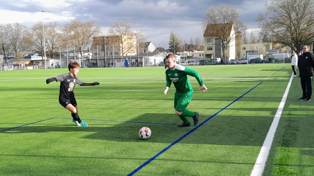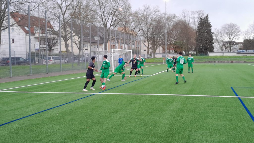 Hagel, Regen, Regenbogen, Sonne, Wind – allerlei Wetterphänomene im Wechsel begleiteten nicht nur diese Partie, sondern alle Begegnungen an diesem wechselhaften Sonntag auf den Frankfurter Sportplätzen. Die Gäste starteten mit schnellen Kontern in die intensive Partie auf einem sehr rutschigen Kunstrasen. Yassir Achati hatte sich dynamisch durchgesetzt und hatte schon freie Bahn auf das Griesheimer Tor, zog es aber vor, nach links auf Oliver Solarz zu geben. Der Stürmer schoss am Tor vorbei (2.). Auf der Gegenseite hatte Spielmacher Amar Koljenovic die erste gute Chance der Griesheimer, zog aber knapp am Tor vorbei (5.). Kurz darauf landete eine Flanke von Awet Tekle Hagos am Pfosten des Heddernheimer Tores (10.). Der zum Stürmer umfunktionierte Michael Ofosu prüfte dann SVH-Torhüter Marc Tomczyk, ehe sich die meisten der nur 67 Zuschauer angesichts temporärer heftiger Regengüsse unter die spärlichen Überdachungen stellten.