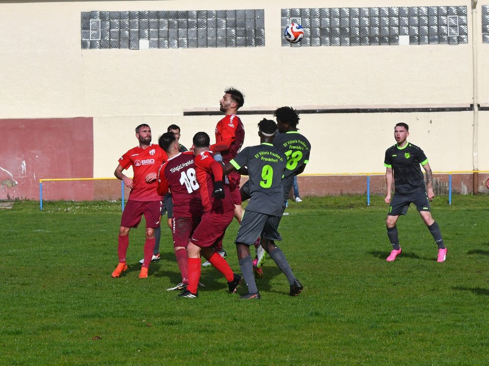 Das Spitzenspiel der Kreisoberliga Frankfurt lockte rund 280 Zuschauer auf die alterhrwürdigen Ränge auf dem Sportplatz an der Sondershausenstraße im Gallus an. Bei besserem Wetter hätten es gut und gerne mehr sein können. Beide Teams mussten mit den widrigen Wetterbedingungen kämpfen, der das Bespielen des ohnehin schon schlechten Rasenplatzes noch schwerer machte. Zu Beginn tasteten sich die beiden Aufstiegsanwärter auf dem großen Platz noch ab. Torraumchancen blieben zunächst aus, es spielte sich viel im Mittelfeld ab. Der Spielfluss wurde durch Foulspiele und Einwürfe des öfteren unterbrochen. Mit der ersten richtigen guten Chance gingen die Hausherren in Führung, als Nuno Miguel Pires Lopes den startenden Ozan Keskin im Rücken der Preußen-Abwehr gut einsetzte, dieser in den Strafraum zog und mit einem Linksschuss den Torhüter der Gäste Cedric Wohlgemuth zum 1:0 überwand (34.).