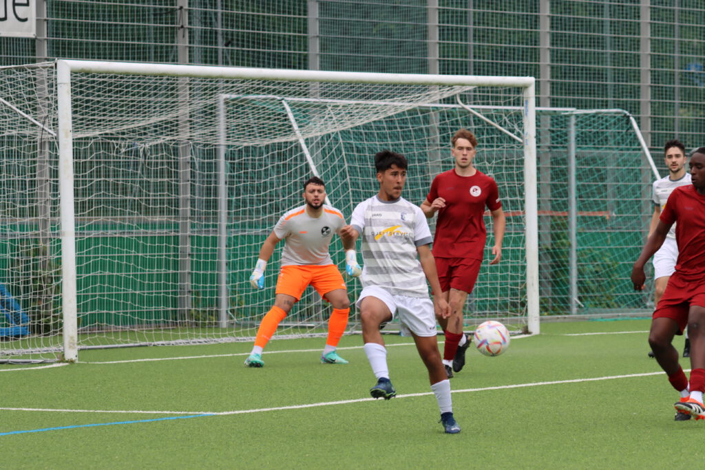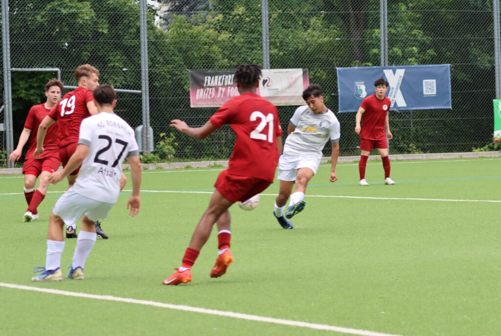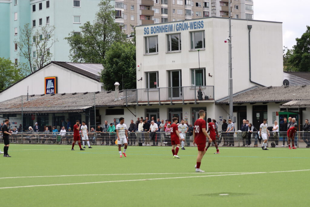 RW-Trainer Ibrahim Cigdem fehlten drei wichtige Spieler, SGB-Trainer Sascha Volk konnte zumindest zwei A-Jugendliche einsetzen, außer Valerio Lettieri auf der Bank standen sonst keine Offensivspieler zur Verfügung. Die Partie begann ziemlich zäh, beide Mannschaften hatten Schwierigkeiten, ins Spiel zu finden. Die Rot-Weissen kamen über die linke Seite in der 22. und in der 24. Minute zu zwei guten Chancen, einmal rettete die Latte, das andere Mal strich der Ball knapp am Tor vorbei. Die Bornheimer kamen zu zwei Torchancen innerhalb des Strafraums, die Schüsse gingen aber weit am Tor vorbei. In der 28.Minutte gab es einen Freistoß für Rot-Weiss auf der rechten Seite in der eigenen Hälfte, ein langer Schlag auf links landete bei Ryunosuke Aso, der den Ball in die Mitte flankte. Patrick Alper Gürser drückte am langen Pfosten den Ball mit letztem Einsatz über die Linie und brachte die Rot-Weissen in Führung. In der 40.Minute versuchte es Filip Carpaci mit einem direkten Freistoß von der linken Seite, SG-Torwart Jonathan Höser konnte den Ball gerade noch zur Ecke retten.
