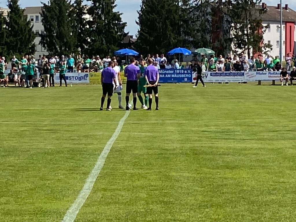 Das Endspiel um den Aufstieg in die Verbandsliga Süd zwischen dem FC Kalbach und dem VfR Groß-Gerau fand in der schönen Sportanlage des SV Münster statt, bei bestem Wetter und sehr guten Platzbedingungen. Der FC Kalbach überraschte mit seiner Startaufstellung, der am Montag mit einer Schulterverletzung ausgeschiedene Torjäger Achraf Gara Ali konnte beginnen und war in der 2.Minute auch gleich im Mittelpunkt des Geschehens, als er im Strafraum gefoult wurde. Den fälligen Strafstoß verwandelte Gara Ali souverän zum frühen 1:0 für die Kalbacher, das die Mannschaft weiter beflügelte. In der 13.Minute konnte Groß-Geraus Torhüter Nico Altoe einen abgefälschten Distanzschuss von Achraf Gara Ali gerade noch entschärfen. Der Tabellenzweite aus der Gruppenliga Darmstadt kam in der 14.Minute zur ersten Chance, als ein abgefälschter Schuss die Latte streifte.