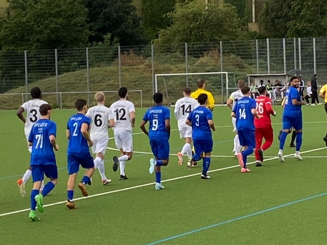 Wenn der Tabellenführer beim Tabellenletzten antritt, so ist die Favoritenrolle vor dem Spiel klar verteilt, und die Kalbacher begannen auch gut. In der 4 Minute wurde der Ball nach einem Einwurf im Strafraum mit dem Kopf verlängert und Ihab Suleiman hatte keine Mühe, den Ball aus 3 Metern über die Linie zu drücken. Wer jetzt gedacht hätte, das Ergebnis würde klar ausgehen, sah sich getäuscht, die Speuzer steckten den frühen Rückschlag erstaunlich gut weg und die Kalbacher ließen es im Gefühl des frühen Tores ruhiger angehen, sie hatten es jedenfalls sehr schwer, sich klare Chancen zu erspielen. In der 10.Minute landete ein Kopfball von Humang Park an der Latte und Achraf Gara Ali zielte in der ersten Halbzeit zweimal knapp vorbei. Die Sportfreunde spielten gut mit und kamen auch immer wieder vor das Tor der Kalbacher, die jedoch alles klären konnten.