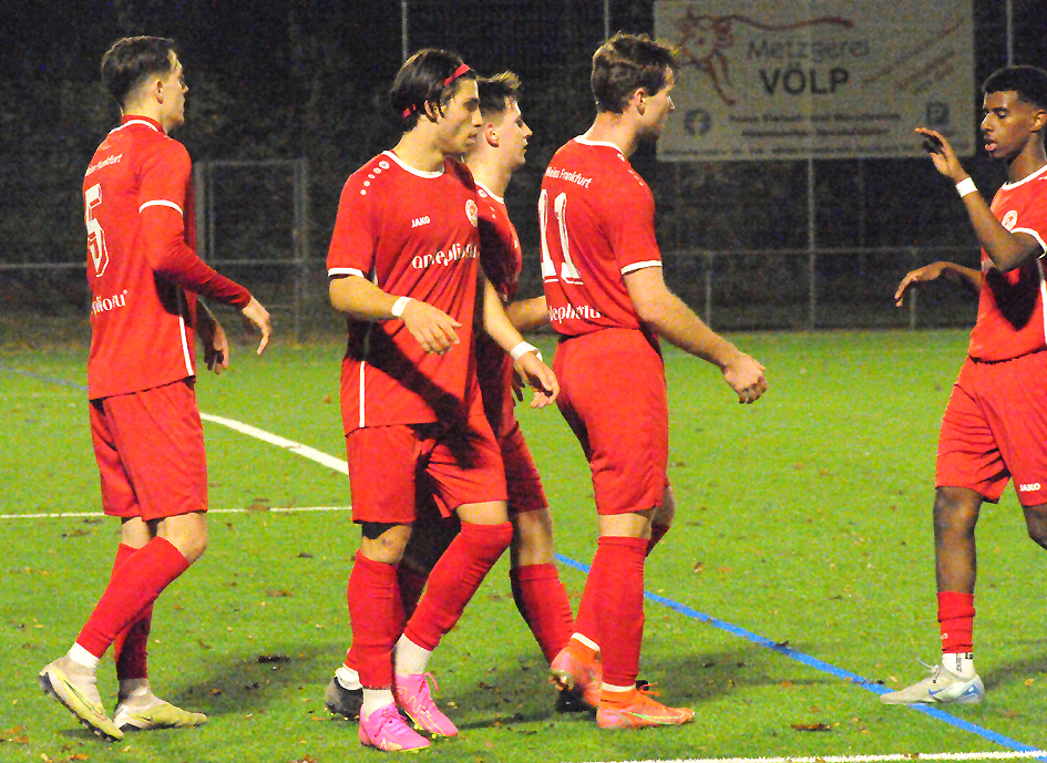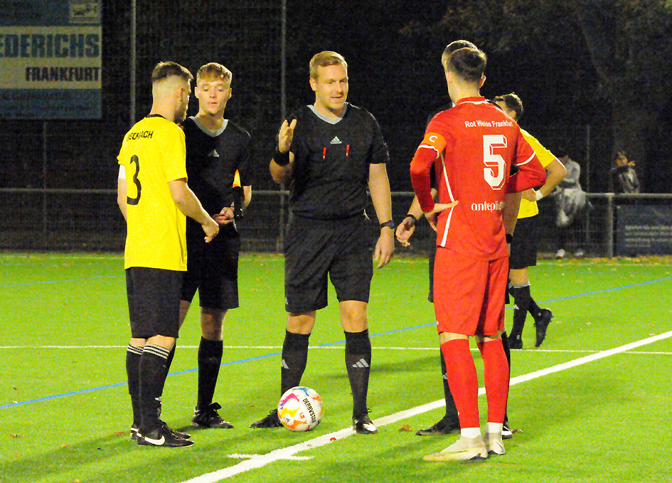 In der ersten Halbzeit entwickelte sich ein munteres Spiel zweier Mannschaften: die FG Seckbach, seit Mitte August in 9 Spielen ungeschlagen, auch die Rot-Weissen nur mit einer Niederlage aus den letzten sieben Spielen. Auf den Sieger der Partie wartete eine Belastungsprobe, denn nach dem Spiel am Donnerstag steht am Sonntag ein Ligaspiel an und am Dienstag bereits das Achtelfinale beim SV 07 Heddernheim. Doch beide Mannschaften versuchten auf dem neuen Kunstrasen, zu Torchancen zu kommen, die größten hatten auf Seite der Seckbacher Bo Lockl in der 8.Minute, der an RW-Torwart Nicolas Meurer Camacho scheiterte, auf der anderen Seite konnte Seckbachs Torwart Jonas Hess in der 26.Minute nach einem Schuss von Elias Weber im Nachfassen retten.