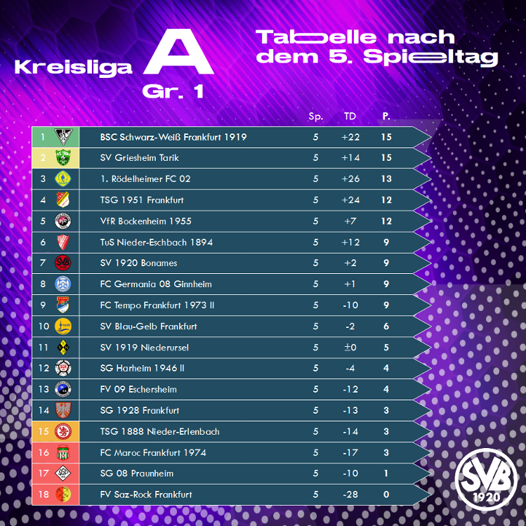 Der SV Bonames gewann bei Schlusslicht FV Saz-Rock mit 6:1. Saz-Rock steht nach dem KOL-Abstieg auch eine Klasse tiefer ganz unten, weist bereits 2:30 Tore und null Punkte auf.