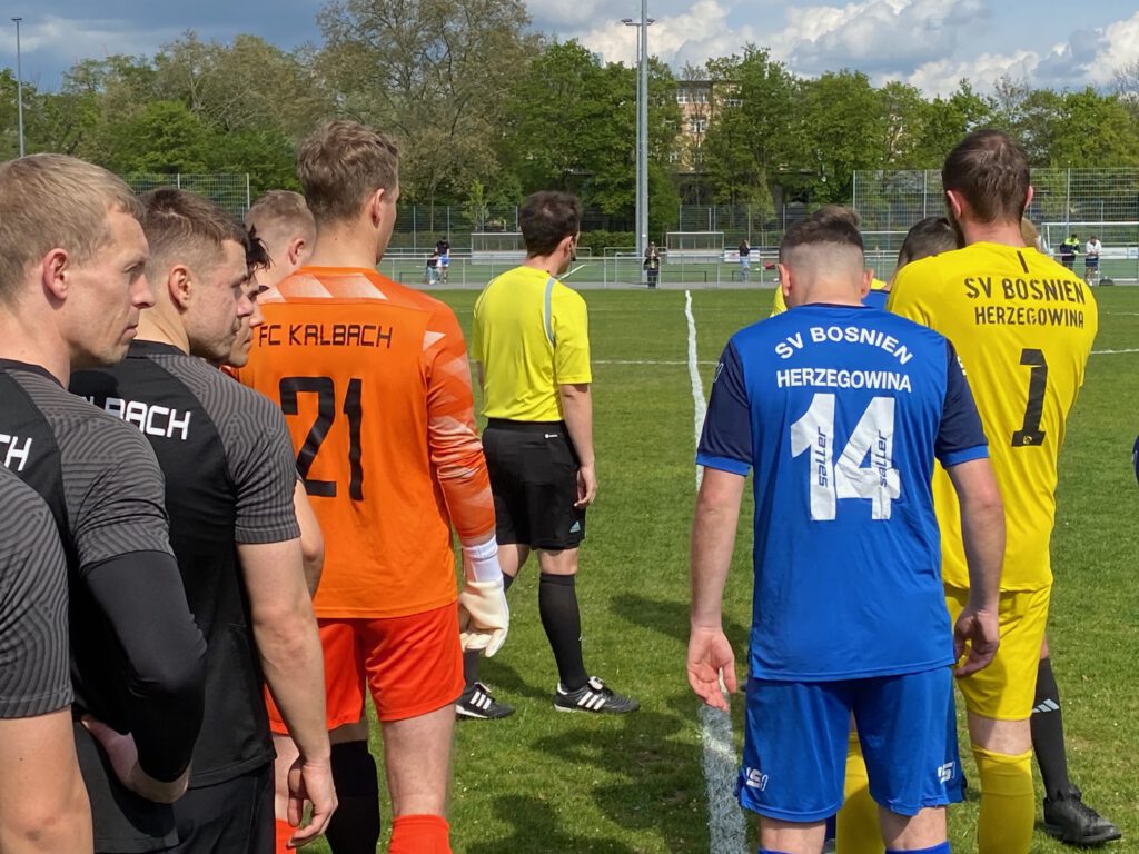 Für den Spitzenreiter FC Kalbach war es ein schwerer Gang zum SV Bosnien/Herzegowina, der aus den letzten 9 Spielen 7 Siege und ein Remis holte und nur das Auswärtsspiel in Karben unglücklich verlor. Und so entwickelte sich ein Spiel, das die Gastgeber aus Bosnien bestimmten. Die Kalbacher kamen mit dem holprigen Platz nicht zurecht, um ihr gefälliges Kombinationsspiel aufzuziehen, und so hatten die Bosnier ein Übergewicht. Viele Chancen konnten sich aber auch die Gastgeber nicht erspielen, dreimal landete ein Kopfball eines relativ freistehenden Stürmers in den Armen von Fabian Lanthaler. In der 42.Minute dann der Führungstreffer für den SV Bosnien/Herzegowina, ein langer Ball in die Spitze sollte von einem Kalbacher Verteidiger geklärt werden, der Ball traf aber Secouba Diatta und ging von dort am verdutzten Lanthaler vorbei ins Tor. Zur Halbzeit eine nicht unverdiente Führung der Gastgeber.