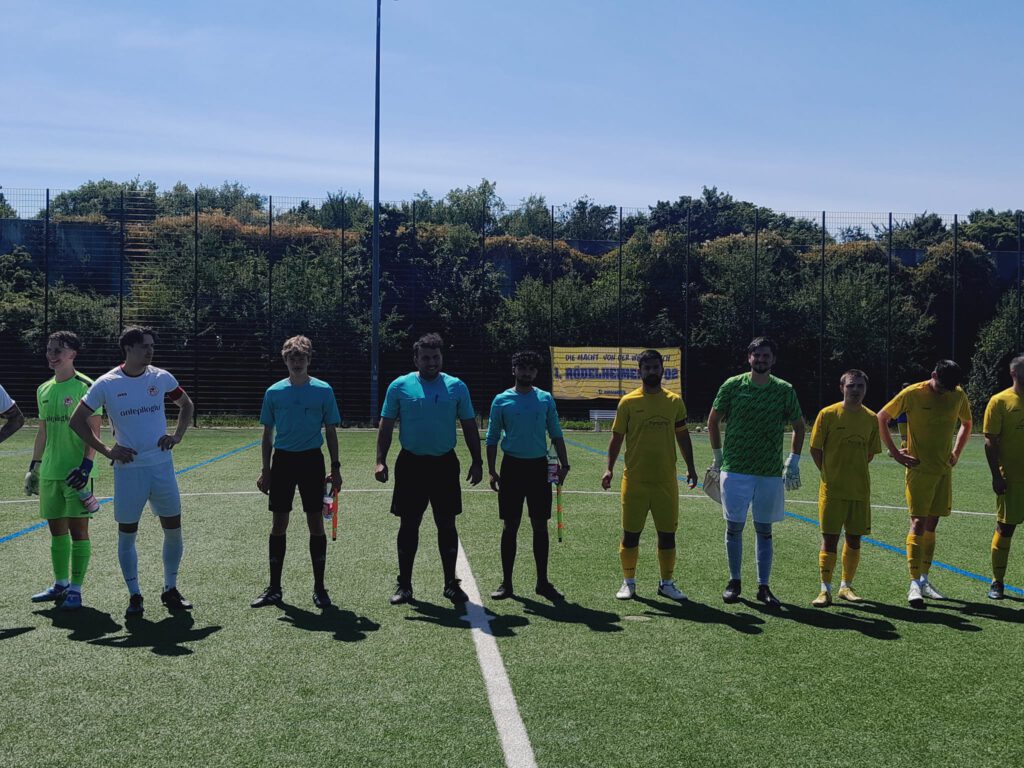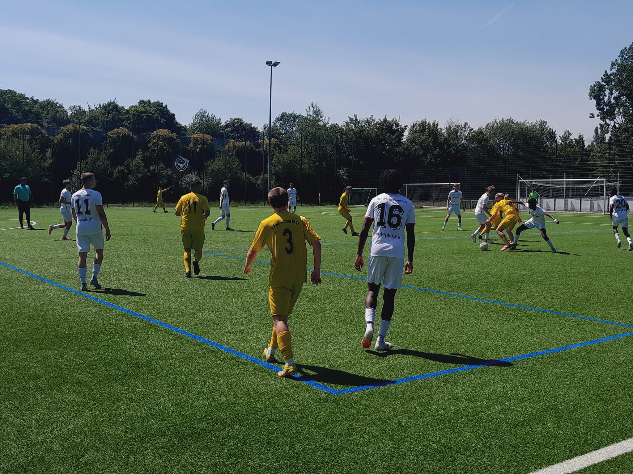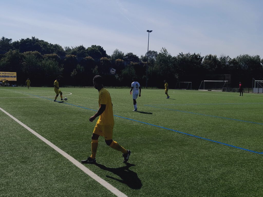 Die rund 40 Zuschauer setzten sich unter die Bäume in den Schatten, die Spieler hingegen mussten auf dem heißen Kunstrasen dem Ball hinterherlaufen. „Wir wussten bis vor kurzem nicht, wann genau die Saison los geht. Wir wollten wie in der letzten Vorbereitung im Winter früh starten, das hat uns gut getan. Da wollen wir mehr Zeit investieren, um mehr Spiele zu haben“, erklärte Rödelheims Trainer Arazm Saghafi den frühen Start. Der Verbandsligist, der mit Tom Meyer und Leo Yan Djialeu Deula zwei Neuzugänge aufbot, ging früh durch Tim Frohne in Führung (2.).