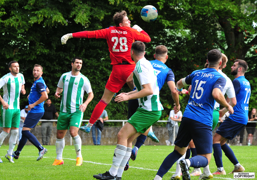 Das Bild änderte sich auch nicht in der zweiten Halbzeit, Oberrad hatte die besseren Chancen, so in der 61.Minute, als Tempo-Torhüter Filip Stojilkovic, der im letzten Jahr noch bei der Spvgg. kickte, einen Ball nach vorne prallen ließ, den Nachschuss von Timo Becker aber parieren konnte, und kurz danach, als der eingewechselte Marc-Christian Künneke nur den Pfosten traf. In der 67.Minute erhielt dann Tempos Spieler Arsen Kryvobedryi die gelb-rote Karte, als er nach einem langen Abschlag von Torhüter Madsen den Lauf eines Gegenspielers unfair stoppte. Von diesem Zeitpunkt an spielte fast nur noch Oberrad und hatte weitere Chancen durch einen Fernschuss von David Bremerich, den Torwart Stojilkovic durch die Hände gleiten ließ, ihn aber noch rechtzeitig vor Überschreiten der Torlinie zu fassen bekam, und durch einen Distanzschuss von dem eingewechselten Boris Brzulovic, den Stojilkovic über die Latte lenken konnte.