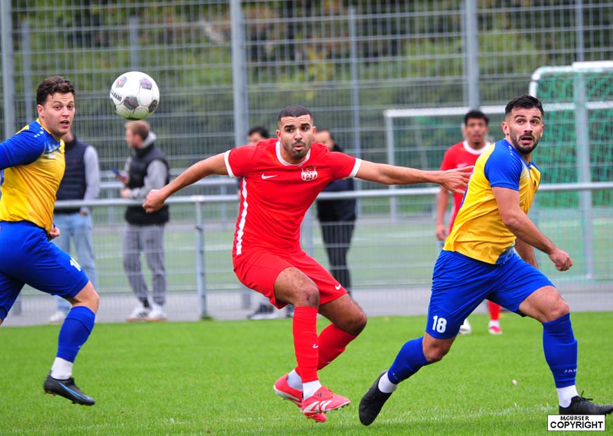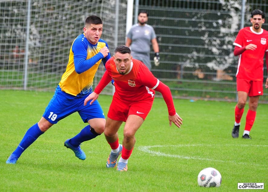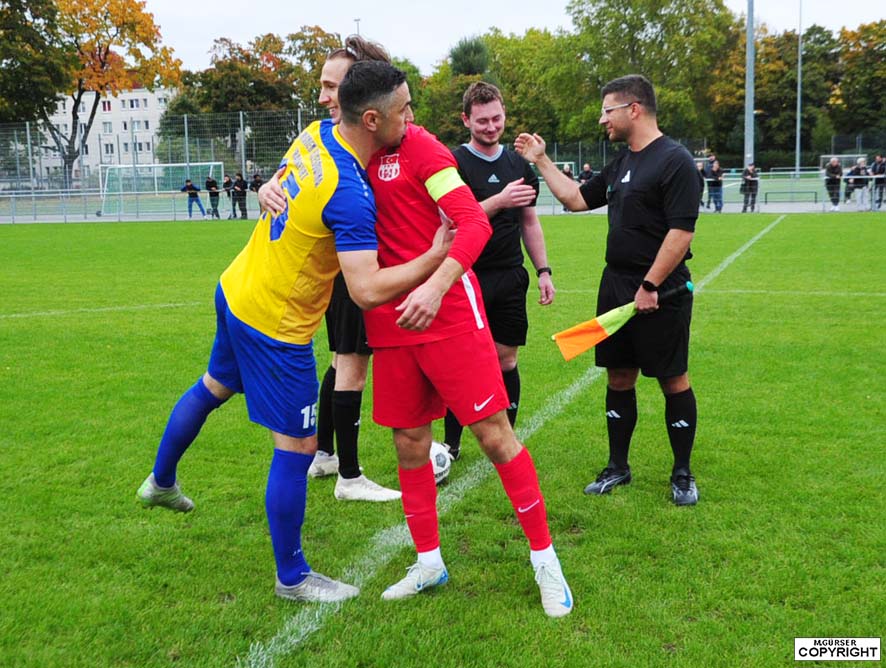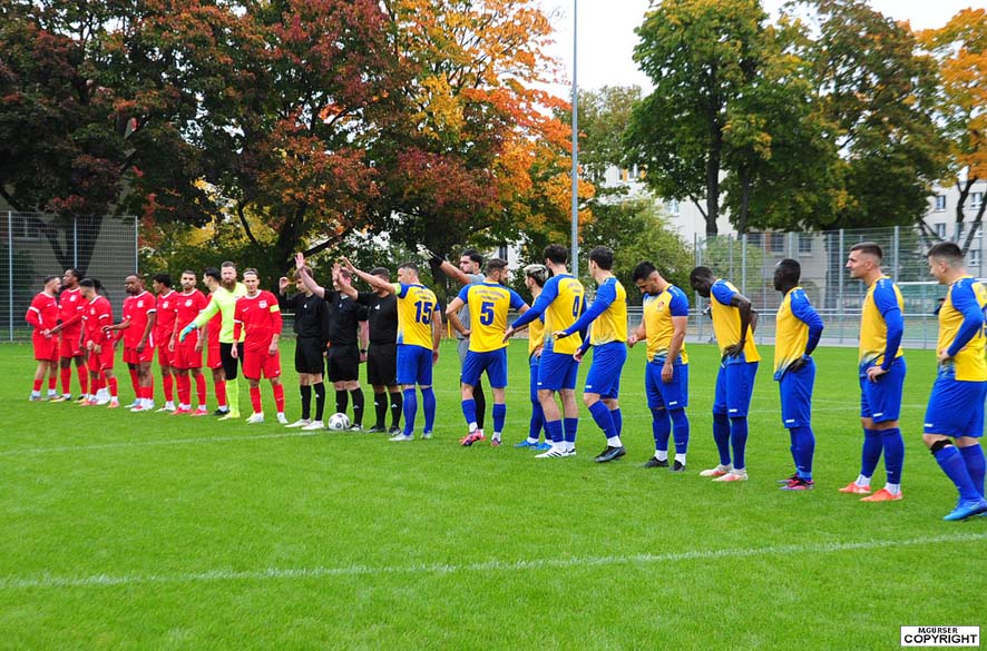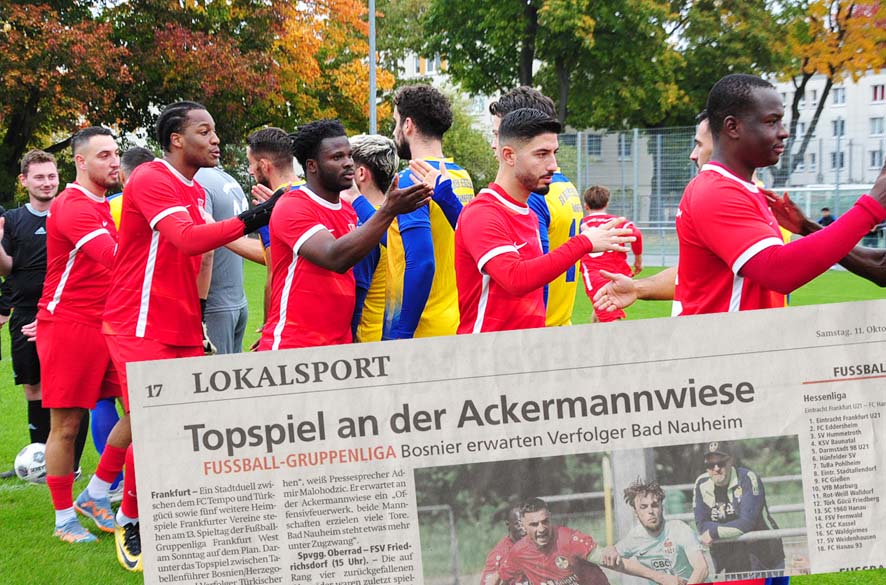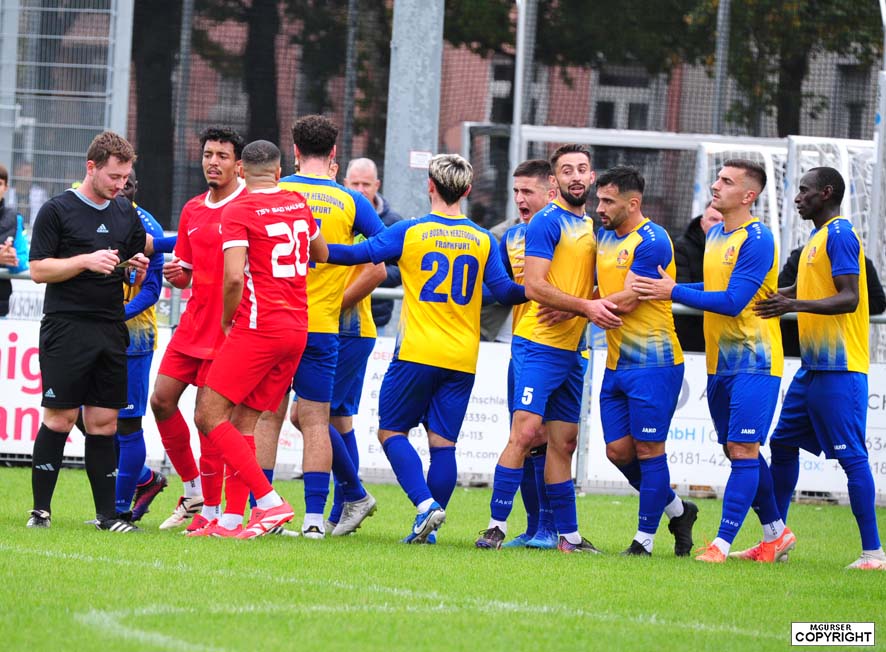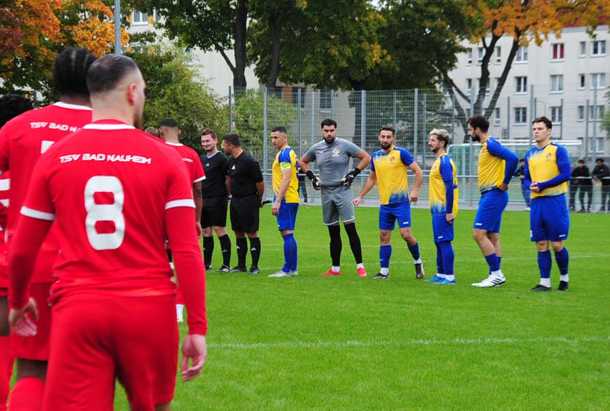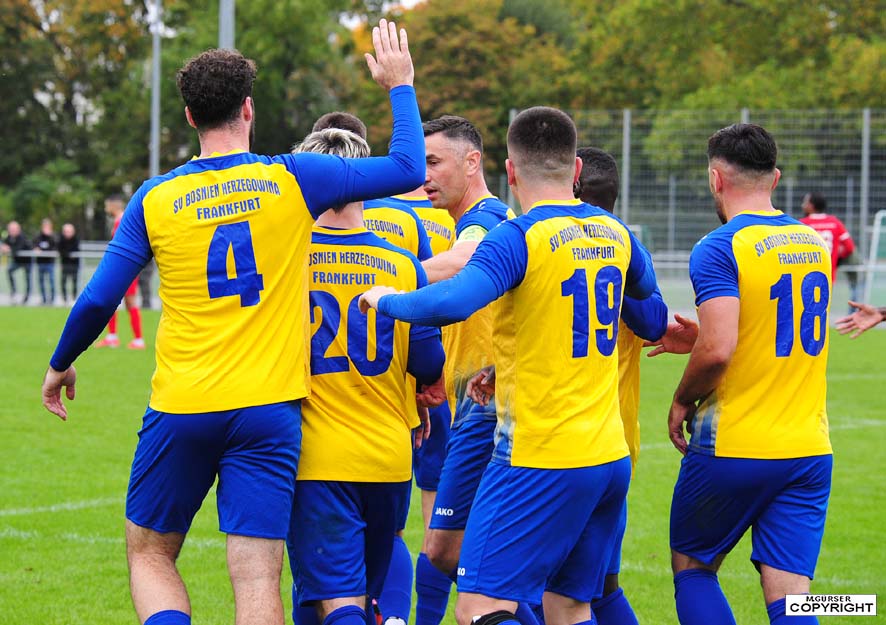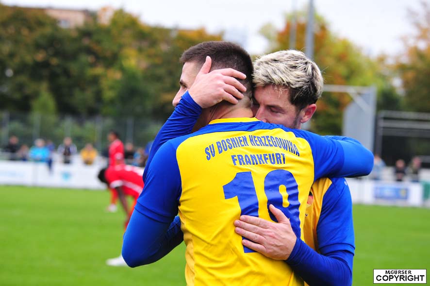 Der Türkische SV Bad Nauheim kam stark ersatzgeschwächt zum Topspiel nach Frankfurt zum SV Bosnien/Herzegowina, Trainer Mehmet Tunay Somun standen nur zwei Feldspieler auf der Bank zur Verfügung. Das merkte man dem Team zu Anfang aber nicht an, auch wenn die Gastgeber die ersten Torchancen hatten durch Boubacar Dialiba Diabang in der 8.Minute und Hamza Reko in der 15.Minute. Durch einen Doppelschlag ging dann der SV Bosnien/Herzegowina mit 2:0 in Führung, in der 22.Minute kam eine weite Flanke auf Hamza Reko, der nahm den Ball direkt und über den Torwart senkte sich der Ball zum 1:0 ins Netz. Nur zwei Minuten später schockte Boubacar Dialiba Diabang den Gegner mit dem 2:0, der danach schon das erste Mal wechseln musste, der verletzte Naoufal Akil wurde durch Luis Raul Vazquez Kundel ersetzt.