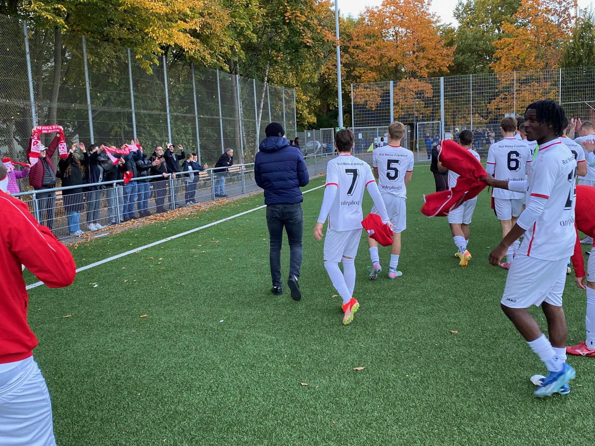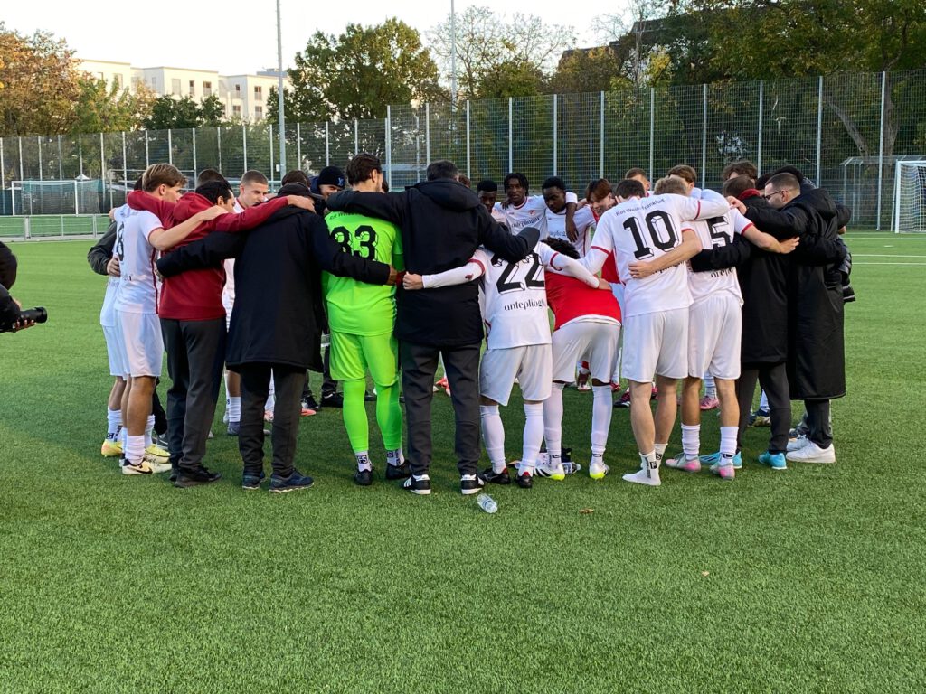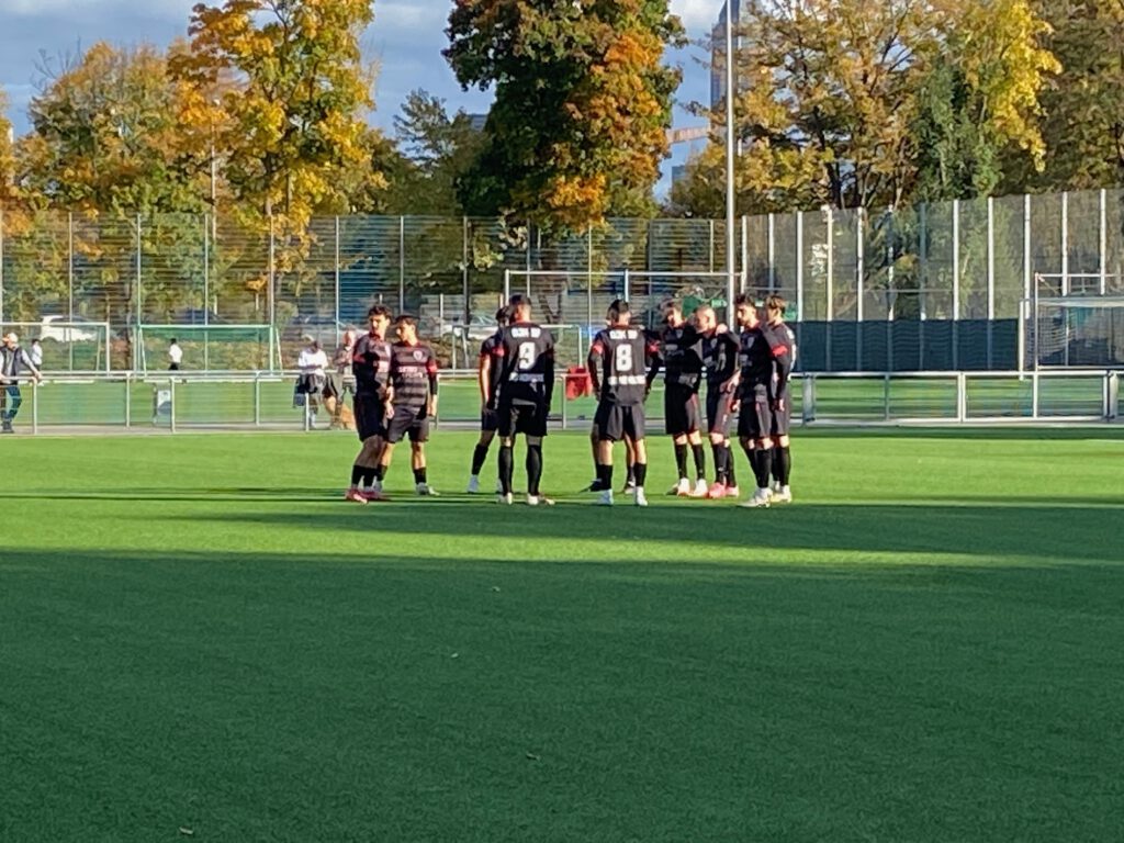 Auch Koziolek scheiterte danach noch am gegnerischen Torwart, und in der 87.Minute schwächten sich die Gäste selbst, als der ehemalige RW-Spieler Filip Cirpaci nach einem Tritt gegen Tim Frohne mit der roten Karte vom Platz geschickt wurde. Die Verteidigung der Gastgeber ließ nichts mehr zu und die Mannschaft brachte den 1:0-Sieg ins Ziel, mit dem RW Frankfurt jetzt nur noch einen Punkt hinter dem Spitzenreiter auf Platz 4 lauert. Trainer Ibo Cigdem und sein Team haben hier eine gute Mannschaft geformt, deren Zusammenhalt erkennbar ist durch die Anfeuerung und Begeisterung auch auf der Bank. Trainer Cigdem zum Spiel: „großen Respekt an meine Mannschaft, es gibt manchmal so Momente, wo man nicht viel sagen muss, ich glaube, das Spiel spricht für meine Mannschaft, absolut verdient gewonnen. Wir haben es nicht geschafft, das 2:0 nachzulegen, aber dennoch sehr gut wegverteidigt, auch einen U19-Spieler dabeigehabt, der zum ersten Mal bei uns gespielt hat (Berkay Altay, die Redaktion), der einfach mal in die Bresche gesprungen ist, und man hat nichts gemerkt, deswegen gibt es nicht viel zu sagen. Und am Dienstag geht es weiter.“