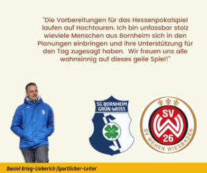 Ganz viel Freude, aber auch ein wenig Unglauben. Die sportliche Entwicklung der letzten Jahre ist kein Zufall aber so nicht zwingend vorhersehbar gewesen. Dass wir uns für das Achtelfinale des Hessenpokal qualifiziert haben und uns jetzt in einem Pflichtspiel mit einem Profiverein messen dürfen ist schon ein wenig surreal für uns alle.