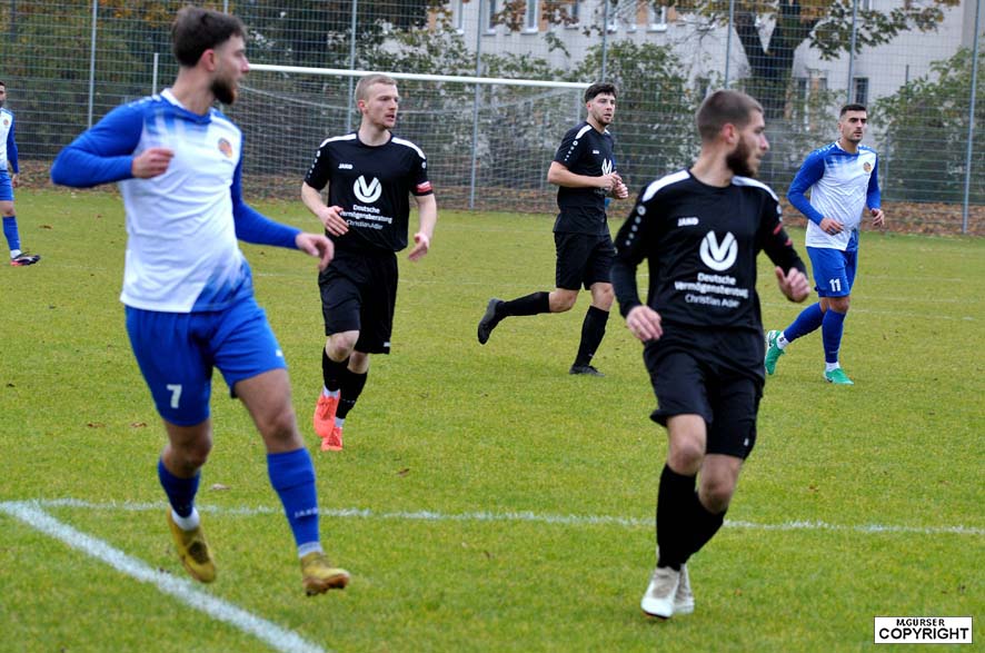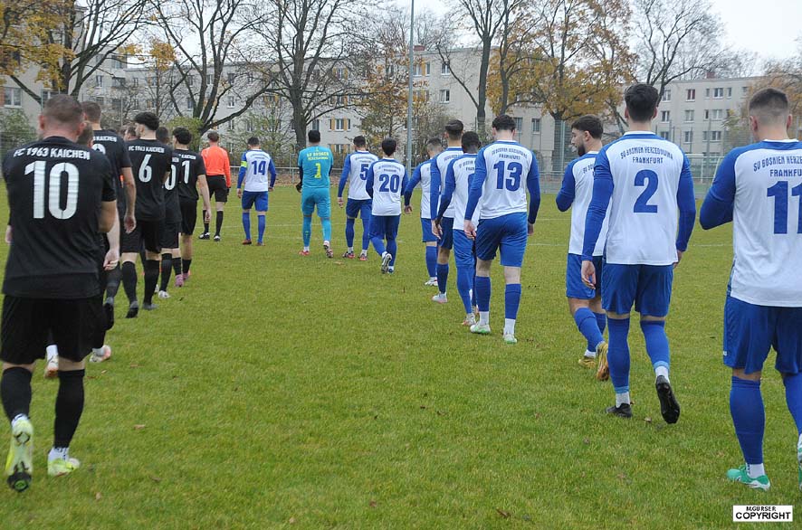 Der SV Bosnien/Herzegowina wechselte gegenüber dem Sieg bei Türkgücü Frankfurt am letzten Wochenende auf einigen Positionen, unter anderem saßen Toptorjäger Almir Derdemez und Hamza Reko bei Spielbeginn nur auf der Bank, Bosniens Pressesprecher Admir Malohodzic: „wir haben ein bisschen durchgewechselt, aber im Augenblick ist es so: egal wer spielt, es funktioniert.“ Es dauerte bis zur 18.Minute, ehe Boubacar Dialiba Diabang den Favoriten mit 1:0 in Führung brachte, bis die Gäste aus Kaichen in der 30.Minute durch einen ihrer wenigen Konter überraschend durch Tim Kraft ausgleichen konnten. Aber erneut Dialiba Diabang brachte die Bosnier fast mit dem Pausenpfiff in der 45.Minute wieder mit 2:1 in Führung.