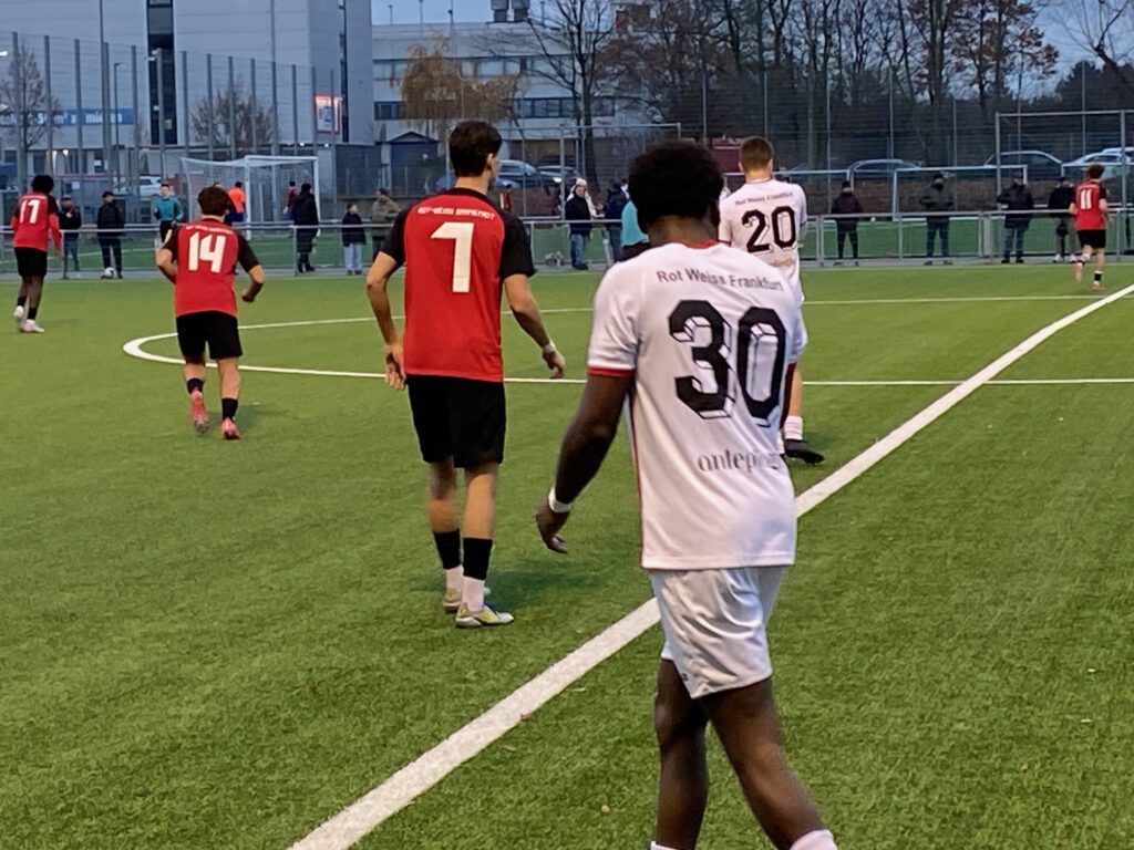 In den letzten 10 Minuten mobilisierten die Gastgeber noch einmal alle Kräfte und begannen mit dem Schlussspurt, doch es gab nur noch eine Chance zum Siegtreffer in der 83.Minute. Koziolek tankte sich an der Grundlinie durch und spielte einen Rückpass auf Abdussamed Gürsoy, doch dessen Schuss wurde in letzter Sekunde noch zur Ecke abgeblockt. So blieb es bis zum Schluss beim gerechten 1:1, wodurch die Frankfurter vor der Winterpause noch von der zweiten Mannschaft von Kickers Offenbach in der Tabelle überholt wurden und auf Platz 2 überwintern. Frankfurts Trainer Ibo Cigdem: „es ist ein gerechtes Ergebnis in einem guten Spiel mit hohem Tempo. Wir waren in der Offensive teilweise zu umständlich und nicht gierig genug, aber man merkt, dass die Mannschaft zum Schluss schon auf dem Zahnfleisch geht, unsere Herangehensweise kostet viel Kraft. Wir waren nicht abgeklärt und abgebrüht genug, um die Tabellenspitze zu verteidigen, aber mit dem zweiten Platz liegen wir voll im Soll und bereiten uns jetzt in Ruhe auf die restlichen Spiele im neuen Jahr vor.“