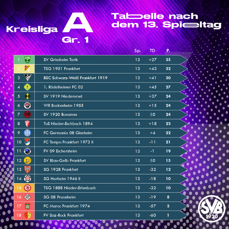 Nach zwei Auswärtsniederlagen in Folge konnte der BSC Schwarz-Weiß 19 mit dem 5:2 über den VfR Bockenheim in die Erfolgsspur zurückfinden. Keine Mühe hatte der Rödelheimer FC beim 7:0 beim desolaten Schlusslicht FV Saz-Rock. Der SV Bonames gewann mit 2:1 beim SV Blau-Gelb und weist eine ausgeglichene Tordifferenz auf.