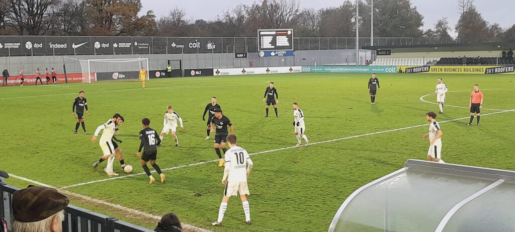 Steinbach war nur mit 16 Spielern in den „Ahorn Camp Sportpark“ nach Dreieich-Sprendlingen gereist. Unterstützt wurde die Mannschaft von einem Fanbus bestehend aus den Alten Herren und der Zweiten Mannschaft, etwa 35 Leute machten sich lautstark bemerkbar. Der Offensivwucht der U21 von Eintracht Frankfurt, die seit zehn Spielen unbesiegt war und vor der Partie bereits 61 Tore erzielt hatte, begegnete der SVS mit einer disziplinierten Verteidigung aus fünf Leuten. Nach vorne ging mit dem Sturmduo Homan Halimi/Petr Kvaca zunächst aber so gut wie nichts. Steinbach war mit Leon Wittke für „WM-Fahrer“ Thore Hütsch als einziger personellen Änderung gegen die gegenüber dem 4:0 gegen Hanau unverändert auflaufenden Frankfurter viel mit Verteidigen beschäftigt. Die Taktik, die Räume eng zu machen und so die Gastgeber spielerisch nicht zur Entfaltung kommen zu lassen, ging fast eine Stunde auf.