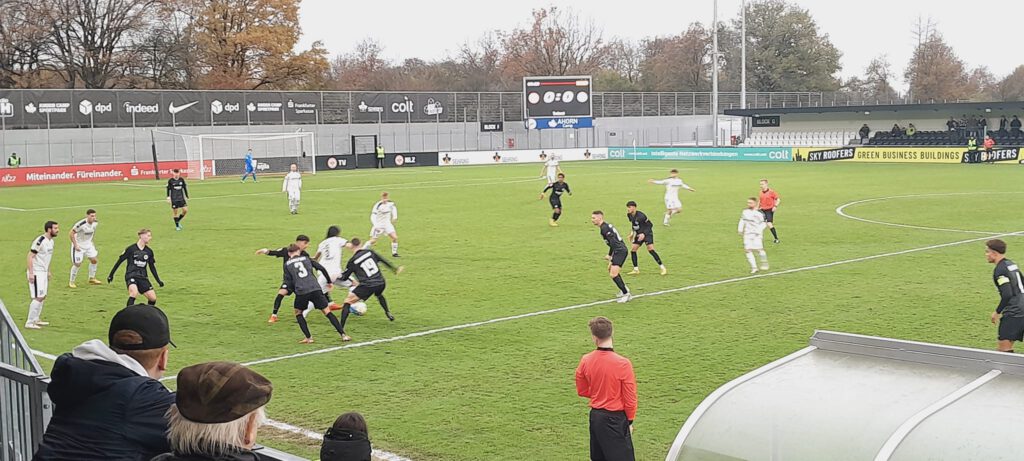 Besonders SVS-Torhüter Sebastian Ernst zeigte sich in Topform, verhinderte mehrmals besonders gegen den spanischen Stürmer Nacho Ferri den frühen Rückstand. Aber auch beim Distanzschuss von Ben-Luca Fisher zeigte Ernst eine Klasseparade, half im „Privatduell“ mit Nacho mit, dass die Null zur Pause für Steinbach an der richtigen Stelle stand. Und was kaum einer im Steinbacher Lager für möglich gehalten hätte, trat in der Nachspielzeit von Durchgang eins ein. Mit der ersten Offensivaktion brachte Kvaca den SVS in Führung (45.+1). Mannschaft, Funktionäre und Anhänger der Gäste konnten es kaum glauben. Zur Pause nahm Trainer Petr Paliatka Senior Stürmer Homan Halimi raus, brachte mit Tom Wiegand noch einen Mann für die Innenverteidigung. Fortan agierte Steinbach im 5-4-1 nur noch mit Kvaca als Stürmer. Paliatka Junior agierte übrigens rechts defensiv sehr aufmerksam, trug mit zur defensiven Stabilität bei. Es war klar, dass die Eintracht, die von einer schwarz gekleideten Fangruppe akustisch unterstützt wurde, diesen Rückstand nicht auf sich sitzen lassen wollte.