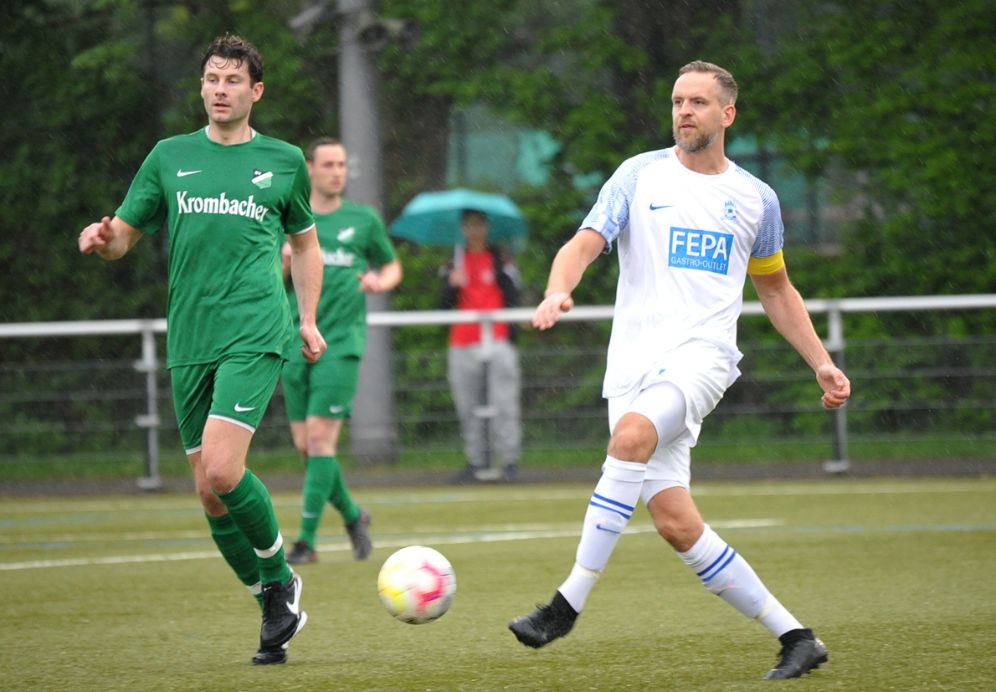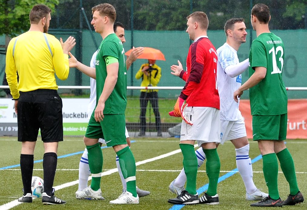 Trotz des unablässig hernieder prasselnden Frühlingsregens spürte man im Umfeld der „Guden“ eine gewisse Aufstiegseuphorie. Weit über die Hälfte der Zuschauer waren Vereinsangehörige oder Anhänger des erst seit 2012 existierenden Fußballclubs. Die beiden formstärksten Teams der letzten Wochen trafen an der Hügelstraße aufeinander und es entwickelte sich eine kampfbetonte Partie, in der um jeden Zentimeter gekämpft wurde. Die „Guden“ hatten in den ersten 20 Minuten ein leichtes Übergewicht. Die beste Chance vergab nach einer Ecke Kapitän Robin Friedrich, der an die Latte köpfte (15.). Gegen Ende des ersten Abschnittes wurden dann die „Preußen“ stärker. Giuliano Amante mit einem Distanzschuss aus 30 Metern, Daniel Rother mit einem Kopfball und Leander Kruse kurz vor der Pause verpassten die Führung der Gastgeber. Für den zweiten Abschnitt wechselte sich Gudesding-Spielertrainer Alexander Root selbst ein und belebte das Spiel der Gäste mit seiner Routine auf Anhieb. Aus der zweiten Reihe brachte Root den FCG mit einem Flachschuss in Führung (54.).
