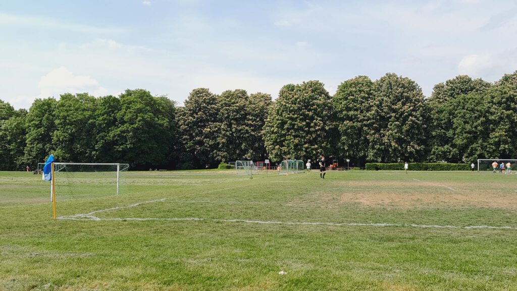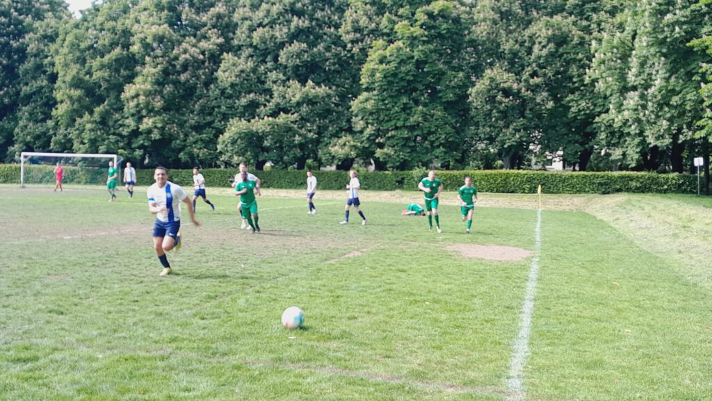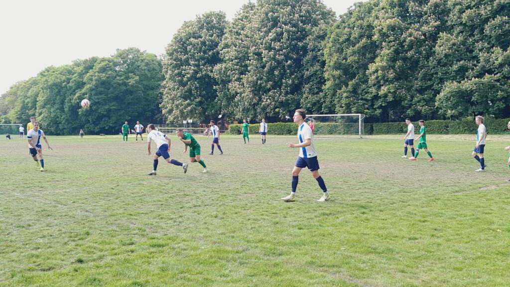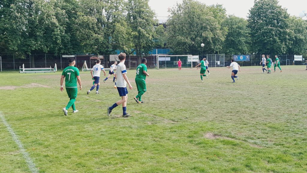 Den ersten Torschuss gab Gästeakteur Balzer ab (2.), ehe die Hausherren mit ihrer einfachen Spielweise zum Erfolg kamen. Daniel Endzweig spielte quer zu Constantin Wunderlin, der zum 1:0 einschieben konnte (24.). Kurz darauf erhielt Jakob Zapke einem langen Ball im Strafraum. Tomczyk kam zu zögerlich raus und der Makkabi-Spieler stocherte den Ball auf dem holprigen Rasen rein (27.). Die Zuschauer nahmen meist auf den Sitzbänken im Schatten der seit jeher unumzäunten Anlage Platz. Nach dem Seitenwechsel verstärkte Heddernheim etwas den Druck. Einen langen Ball von Bagdu erlief Christos Papadopoulos, der zum 2:1 vollendete (52.). Doch postwendend kam Zapke nach einem langen Ball zum Abschluss und traf zum 3:1 (55.). Dann verlud Futsal-Künstler Aziz Derrou seinen Gegenspieler Philipp Siegel und schob zum 4:1 ein (60.). Mit den Hereinnahmen von Giorgianni und Willeführ kam etwas Struktur in das Heddernheimer Spiel.